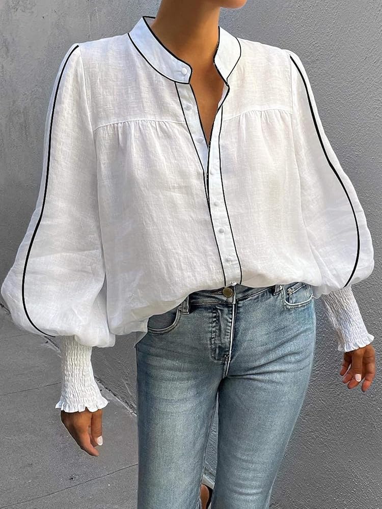 Trendy Design: Women's oversized cotton tops, button down shirts, puff long sleeve shirts, v neck, shirred cuffs, casual loose style, chic and elegant blouse, solid color, ladies tops and blouses 2025.
