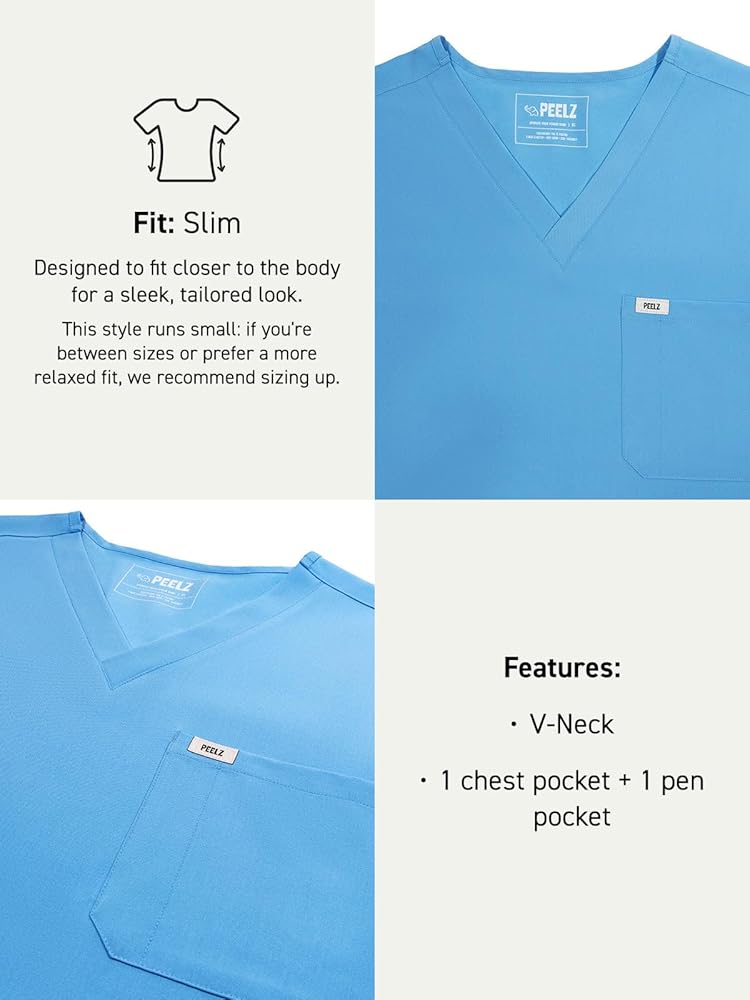 Upgrade your workwear with the Brian V-Neck Basic 2-Pocket Scrub Top from Peelz Scrubs, designed for healthcare professionals and first responders. Experience the Z Factor benefits of high-quality 4-way stretch fabric, maximum comfort, and a tailored fit for ultimate performance. With its versatile style and functional features, this scrub top offers affordable luxury, ensuring you stay comfortable, confident, and professional all day long. This professional men's scrub top showcases a polished V-Neck design, ensuring a sharp and tailored appearance that commands attention. While delivering a clean look, this men's scrub top also excels in utility with its convenient, integrated patch chest and pen pockets, efficiently keeping essentials within easy reach during demanding shifts. Whether you're charting patient data or responding to emergencies, this scrub top keeps you prepared. Experience unmatched comfort and free range of motion through its 4-way stretch fabric, complemented by side vent openings at the bottom for a flexible fit that adapts to your movements. Designed for durability, this breathable short-sleeve scrub top is crafted from machine-washable material that maintains its shape and vibrant color, even after countless washes in cold water. This men's scrub top not only enhances your professional image but also supports a busy lifestyle with its easy-care properties. Stay cool and comfortable throughout long hours with this lightweight scrub top, part of the ultimate scrubs men collection designed for healthcare professionals. Crafted with eco-friendly packaging and built to last, this top supports both your lifestyle and the planet. Don't settle for ordinary—get the Brian V-Neck Scrub Top today and redefine your professional wardrobe.