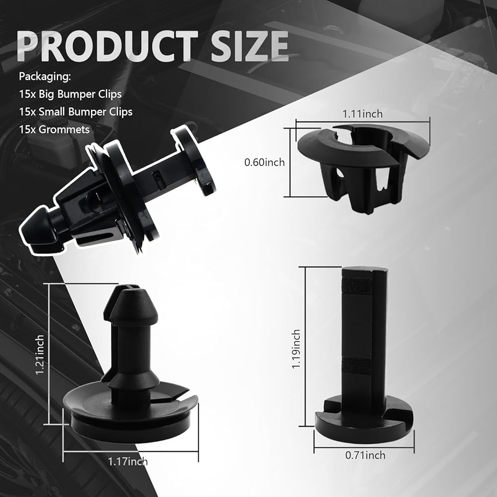 • Package Contains: The package includes 15*front bumper trim clips and 15*grommets, seamless alignment of clip and grommet with a single snap, which can withstand severe vibrations caused by harsh road conditions and avoid front bumper from rattling