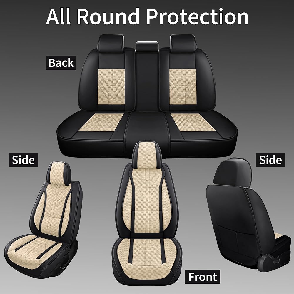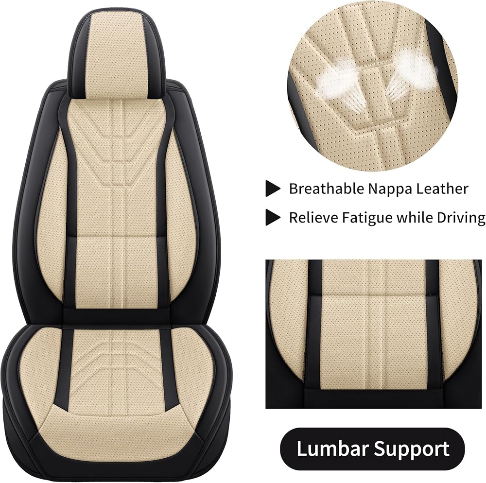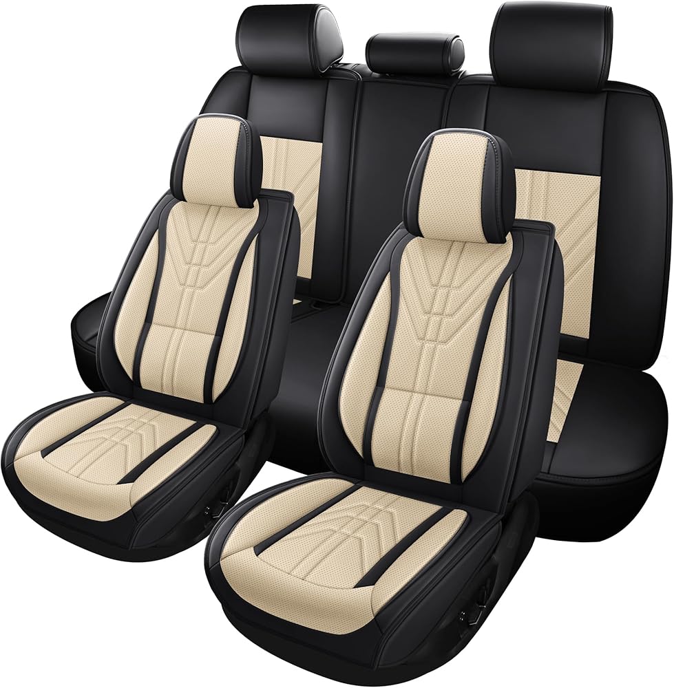 otoez Car Seat Covers Full Set, 5 Seats Nappa Leather Seat Cover for Car Seden SUV, Waterproof Universal Automotive Seat Protector Full Coverage Vehicle Front and Rear Seat Cover (Black & Beige)
