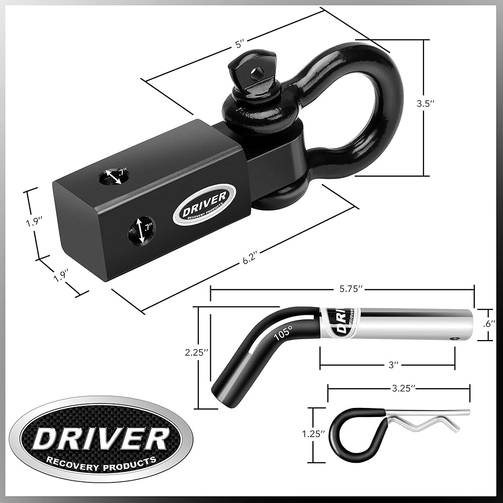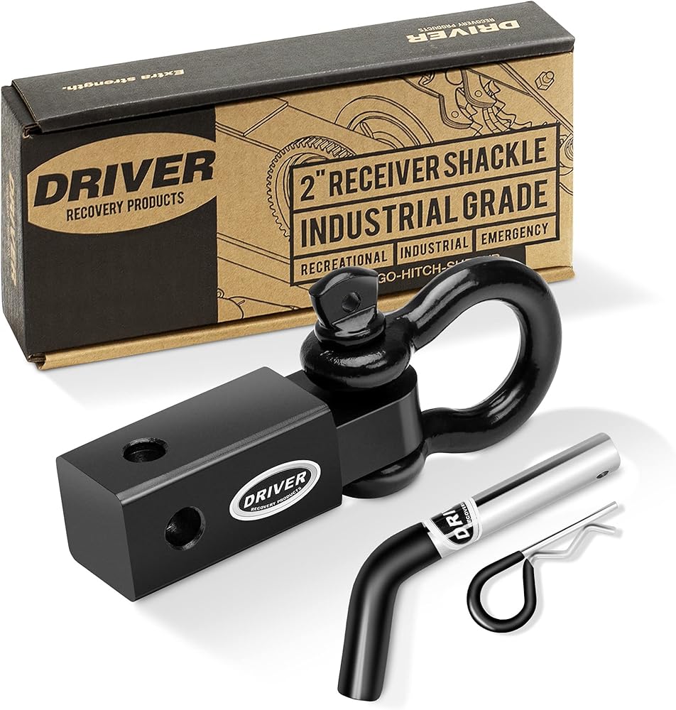 The Driver Recovery Products Hitch Receiver Tow Ring provides the ultimate peace of mind for simple and efficient vehicle recovery or heavy-duty towing needs for the avid outdoor enthusiast and adventurers. Boasting a 10,000 pound towing capacity, you'll never risk getting stuck again off-roading, in the snow, or anywhere else you go. This shackle hitch is crafted from solid machined steel and finished with a heavy-duty powder coating, for exceptional all-around strength and durability. Mounting easily to 2" receivers, this receiver tow ring features dual hitch pin holes and a 5/8" solid steel hitch pin, providing flexibility and the option to connect the shackle horizontally or vertically. Driver Recovery Products is a leading brand within the hitch rack and trailering market, widely recognized for excellence at providing a wide range of premium accessories that offer exceptional functionality at an affordable price. Driver Recovery Products Hitch Receiver Tow Ring for Trucks and SUV's - 10,000 pound Load Capacity - Mounts to 2" Receivers