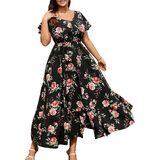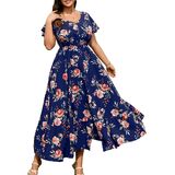 Features: V Neck/ Short Sleeve/ A Line/ Button Decoration/ High Split Hem/ Flowy Tiered/ Plus Size Maxi Dress for Women / Plus Size Summer Dresses For Women 2025/ Women V Neck Dresses/ Puff Sleeve Dress/ Women High Waist Long Dress/ Swing Boho Dress/ Button V Neck Maxi Dress