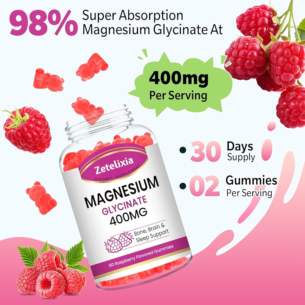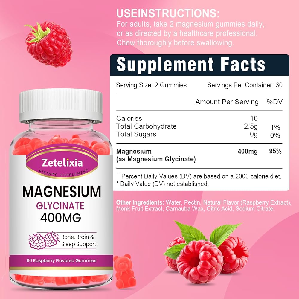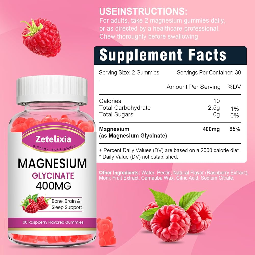 Pectin based and Yummy Raspberry Flavor: Each serving 2 gummies contain magnesium glycinate, you don't need to worry about any burden on your body from these gummies. We recommend taking 2 magnesium glycinate gummies for a daily supply. 60 gummies in 1 bottle for 30 days supply. No sticky, more delicious