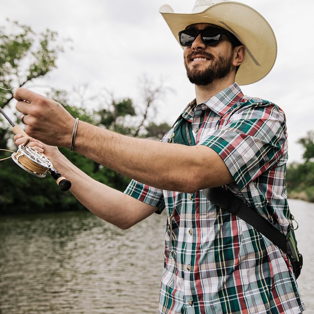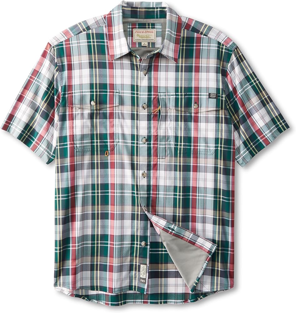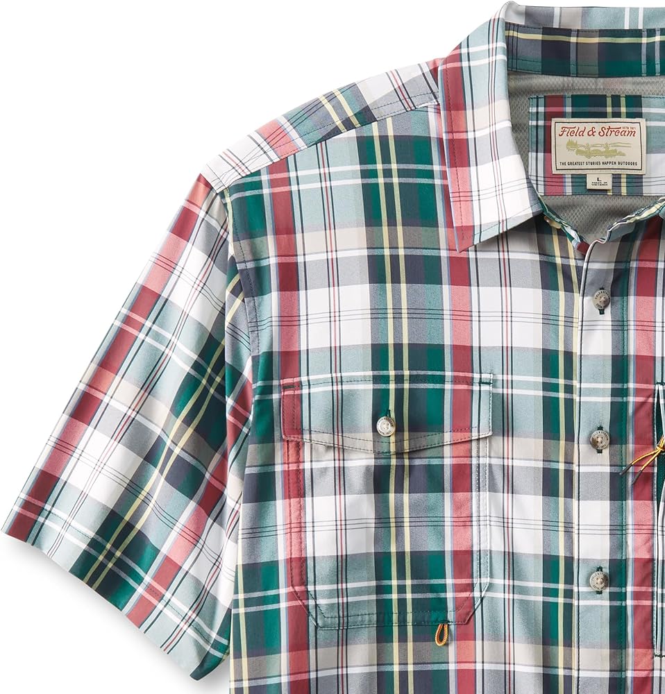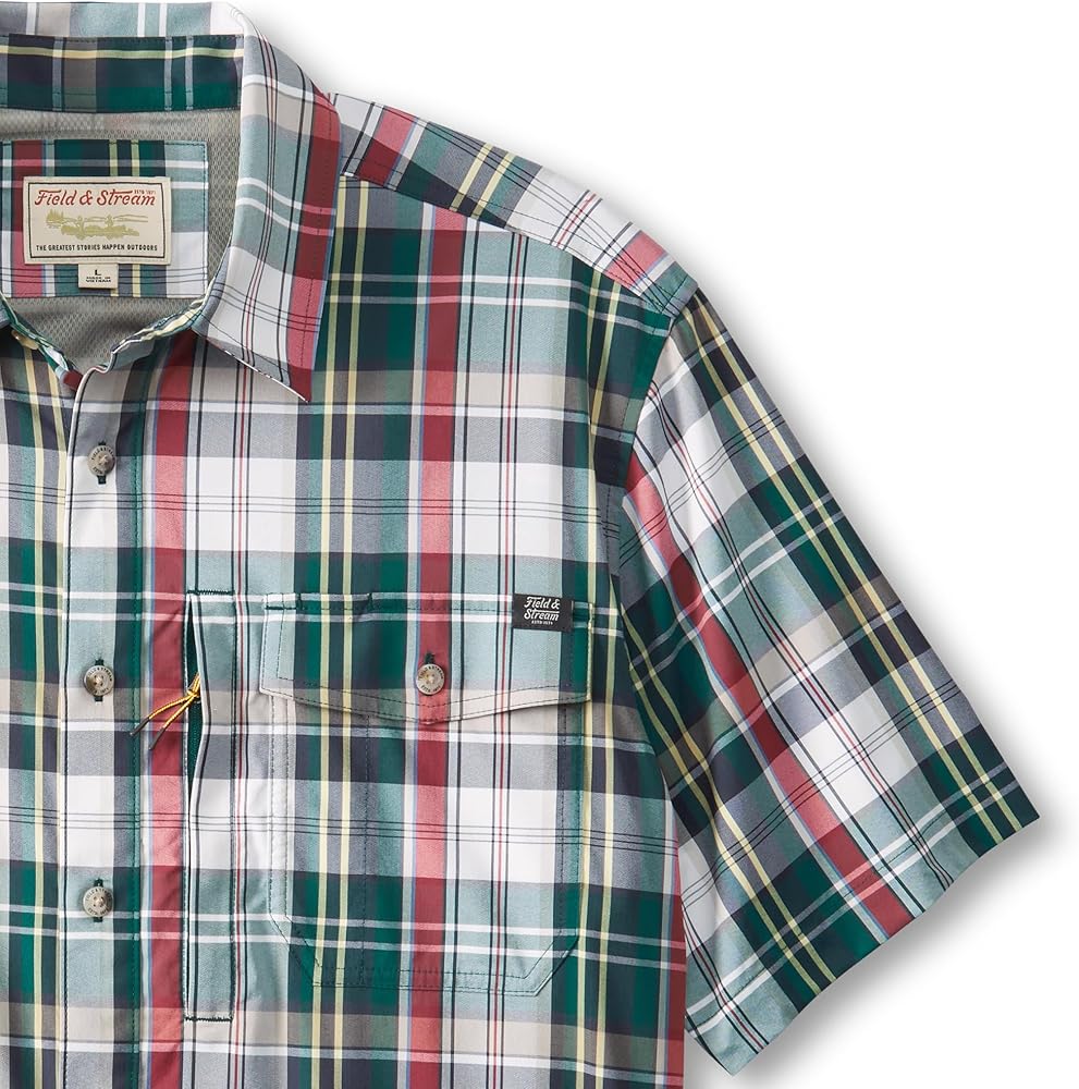 At Field & Stream, we're always looking for the perfect short sleeve performance fishing shirt, so we designed one for outdoorsmen like us with a custom fit for easy movement. UPF 50, temperature regulating materials, 2-way stretch, woven nylon for extra durability and reduced shrinkage, Spandex for added stretch and recovery. Two chest pockets with flaps that button to keep your essentials close and secure, hidden zipper pocket to safely store small essentials and pencil/sunglass slot. The vented flying V back yoke adds mobility and a nod to the west and is vented for added airflow. Built-in microfiber cleaning cloth at the hem for sunglasses or binoculars