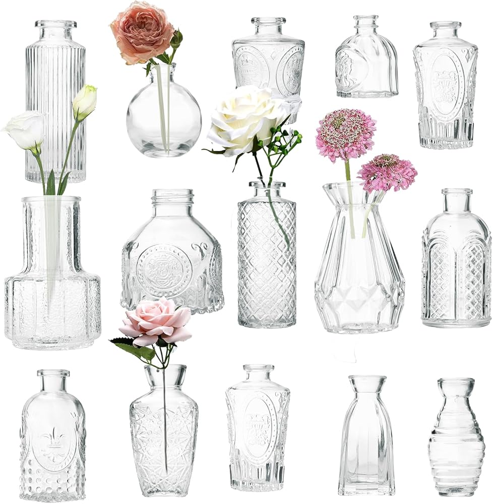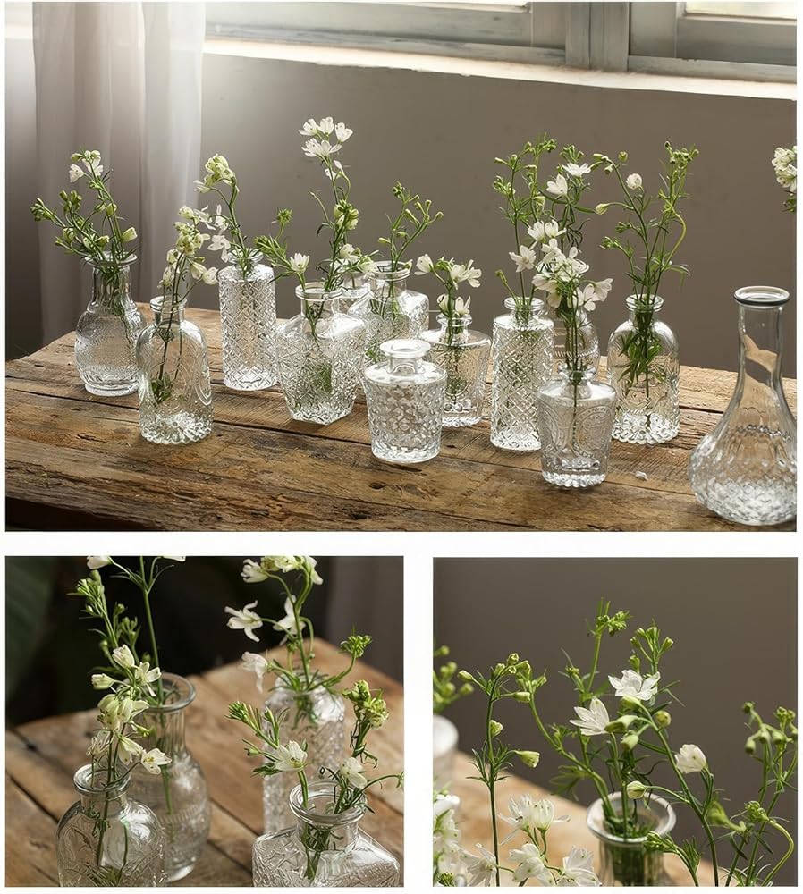 【RETRO STYLE】: A set of 12/15/33 small bud vases, with each transparent glass vase surface adorned with retro relief patterns. They are retro, elegant and classic, and can be utilized for center table decoration to enhance the style of the interior space