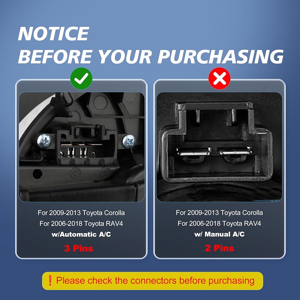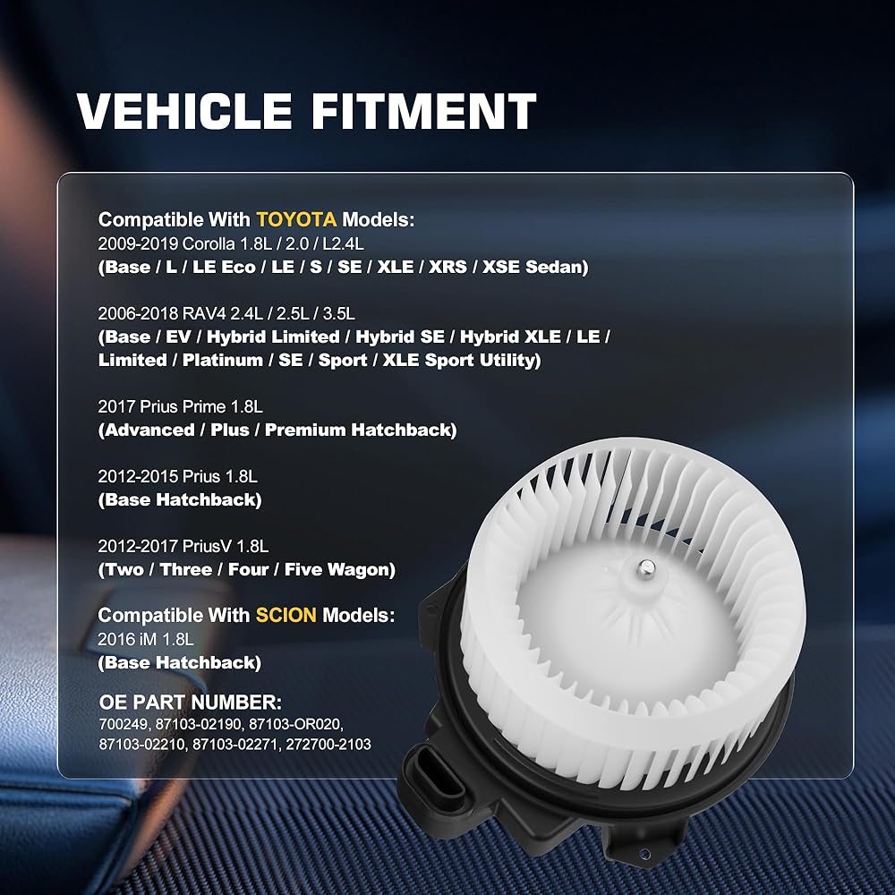 [Vehicle Fitment]: Front HVAC Blower Motor compatible for Toyota Corolla 2009 2010 2011 2012 2013 2014 2015 2016 2017 2018 2019, Compatible with Toyota Prius 2010 2011 2012 2013 2014 2015, Compatible with Toyota Prius V Wagon 2012 2013 2014 2015 2016 2017 2018.