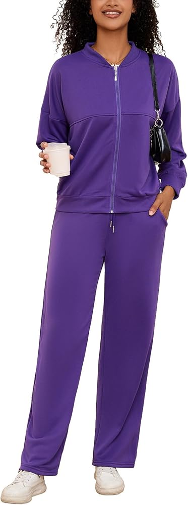 Women's Two Piece Outfits Sweatsuit Tracksuit Lounge Set Zip Up Sweatshirts High Waist Drawstring Wide Leg Sweatpants