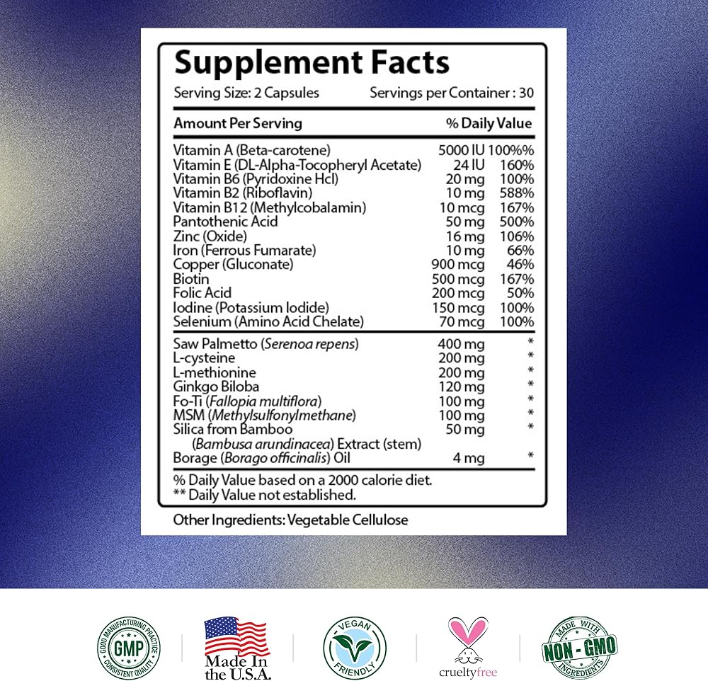 - Rooted in Science Includes 400 mg of Saw Palmetto, plus MSM and amino acids to help maintain stronger, healthier-looking hair.