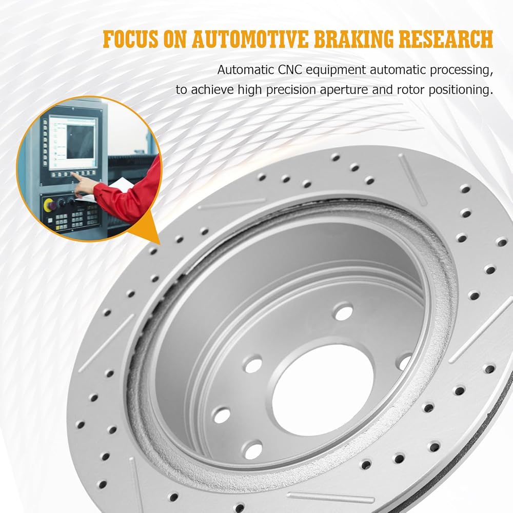 【High-quality craftsmanship】:Vented Drilled and Slotted Disc Brake Rotors are plated with silver coated zinc dichromate for attractive protection against rust and corrosion and long service life. Premium low-dust ceramic formula brake pads keep rims clean and reduce noise