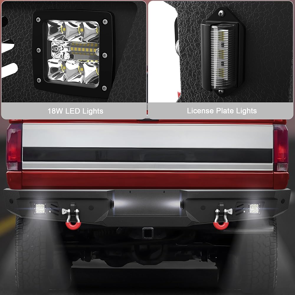 Stylish Design: Sports a rugged look with textured black powder coat finish, with 4x18W fog lights and a 144W light bar for night driving. D-rings and license plate bracket are included as well. (With parking sensor holes)