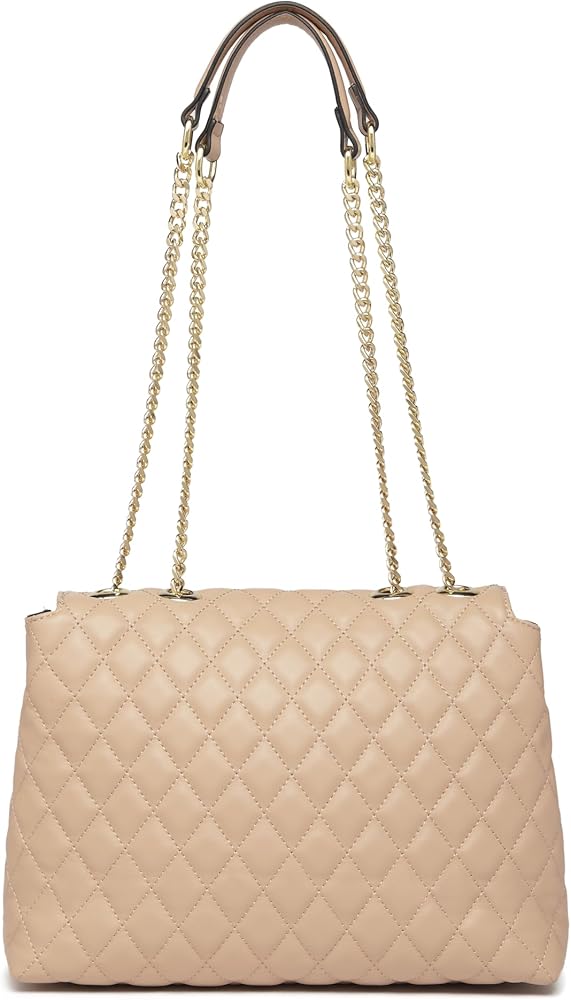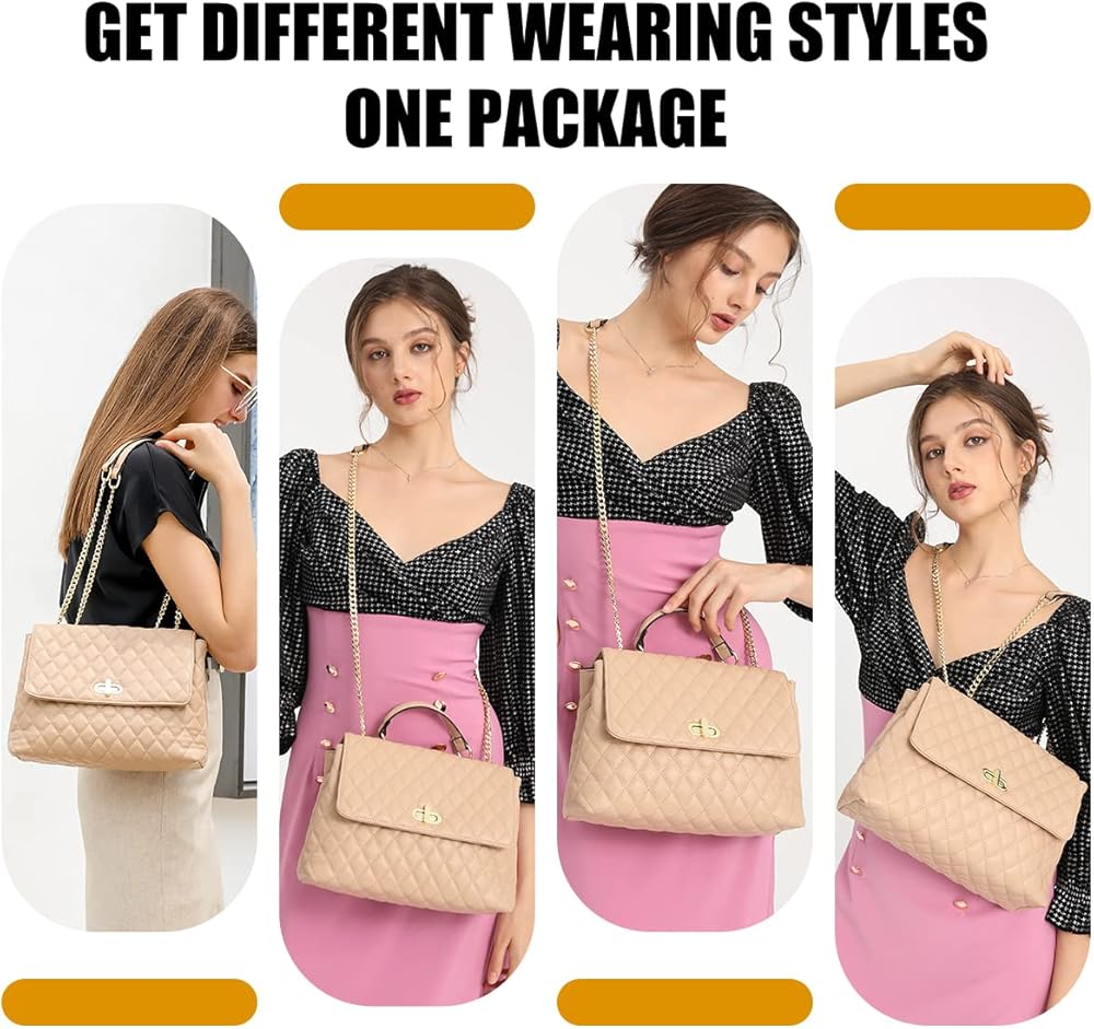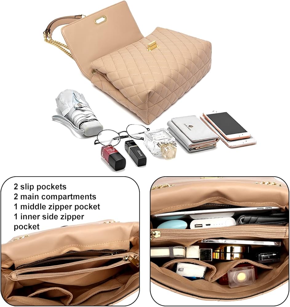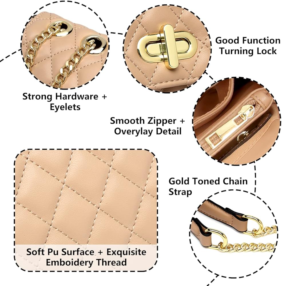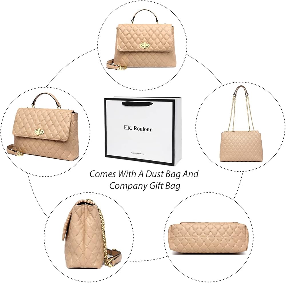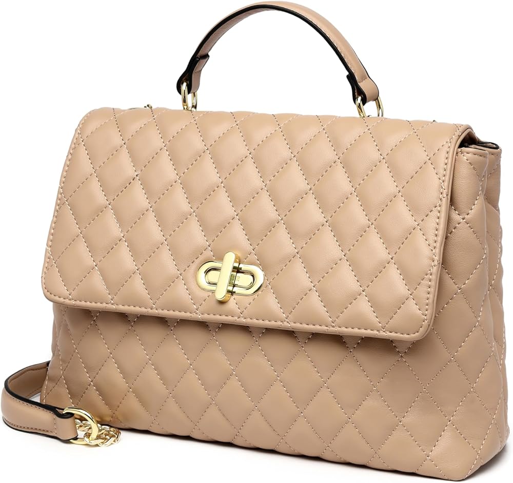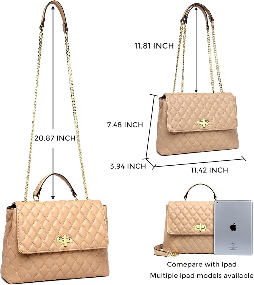 Classic modern quilted purse shoulder handbag, well made with the high quality vegan leather, which is lightweight, durable and soft.The outer shell of this shoulder purse can pass California prop65. Accented with polished gold tone hardware and fashion chain straps. Quilted Flap with distinctive Twist-Lock closure and comes with a dust bag and company gift bag.