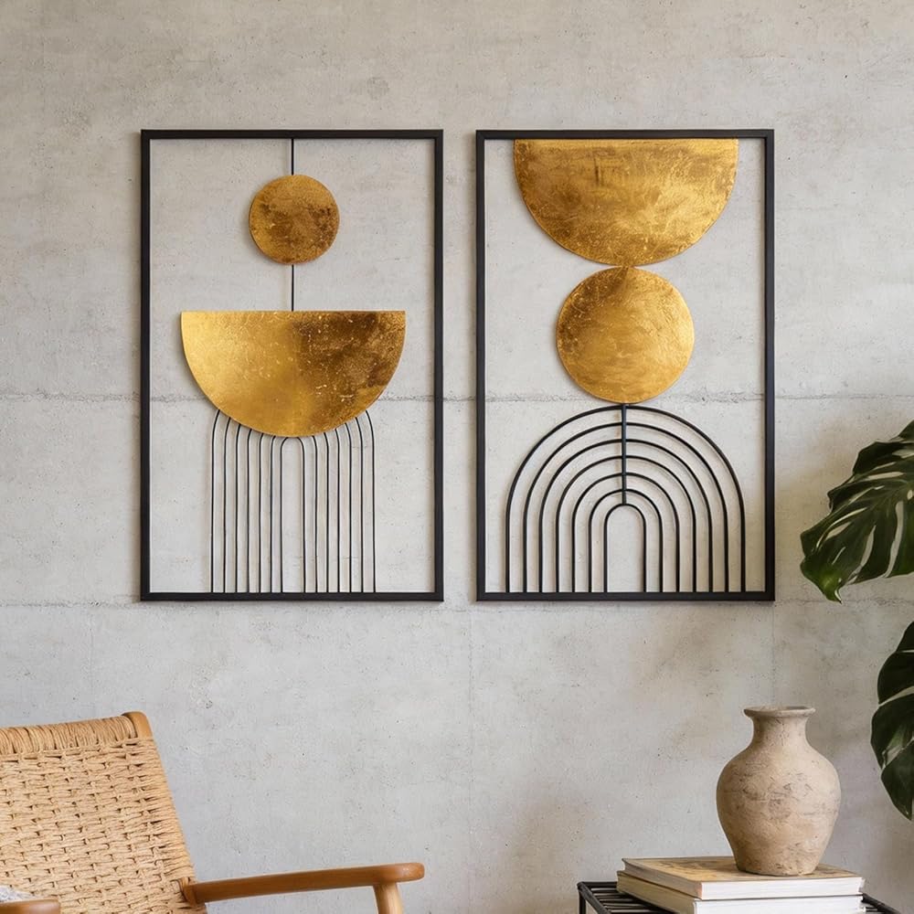 Wall Art Style: Made from metal and mirror, with a textured gold plate, this large statement piece is simple yet striking. The Overlapping welded metal discs create modern irregular shape art that is perfect for any contemporary home setting while bringing light and space to the room.