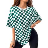 Feature: Plaid Print, All Over Print, Round Neck, Short Sleeve, Drop Shoulder, Loose Fit, Tee Shirts for Women