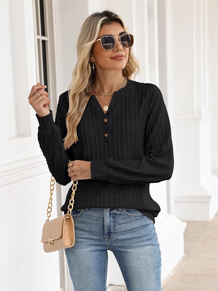 Designs: Long sleeves, henley shirts, textured knit, v neck with buttons, hip length, 2025 fall fashion lightweight sweaters