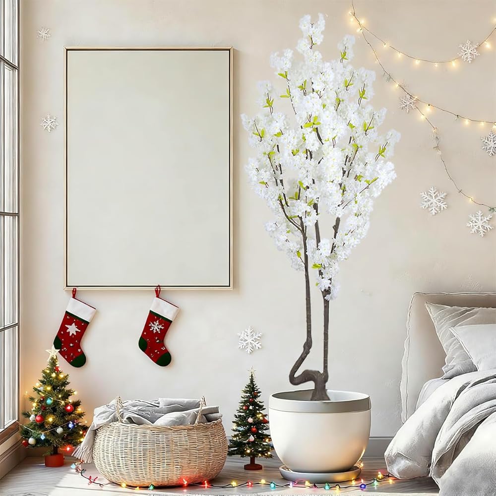 7.2 ft White Artificial Cherry Blossom Tree, Nearly Nature Faux Silk Flower Tree Indoor, Fake Realistic White Flowering Tree for Christmas New Year Home Decor