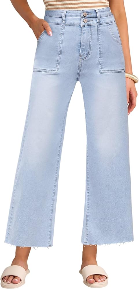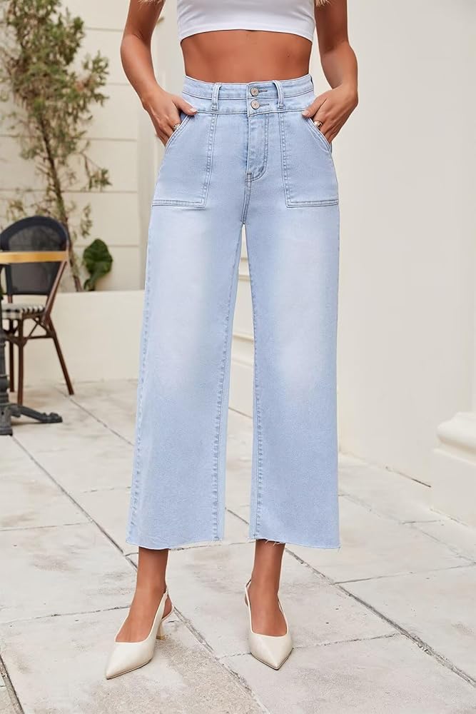Features:Crop length,two button closure,wide leg,Stretch denim fabric,Frayed raw-cut hem