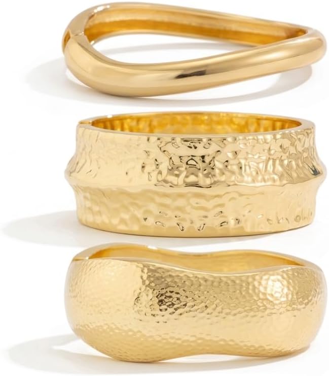 Elevate your accessory collection with this set of 3 chunky gold bangle bracelets, designed for women who love minimalist yet bold style. Crafted from high-quality 14K gold-plated alloy, these bangles feature a trendy irregular shape with a hammered texture, adding a modern touch to any outfit. The set includes a wide arm cuff (2.36” diameter, 1.57” wide, 2.65 oz, fits 6.5-7.5” wrists), a medium hammered bangle (2.36” diameter, 0.86” wide, 1.65 oz), and a sleek, polished bangle (2.36” diameter, 0.19” wide, 1.25 oz) for versatile layering. Each piece is hypoallergenic, scratch-resistant, and polished for a lasting shine. Perfect for daily wear, special occasions, or as a thoughtful gift for birthdays or anniversaries, these bangles effortlessly blend boho charm with contemporary elegance. Pair them with casual, formal, or boho looks to make a statement. Note: Measurements are manual and may have slight deviations