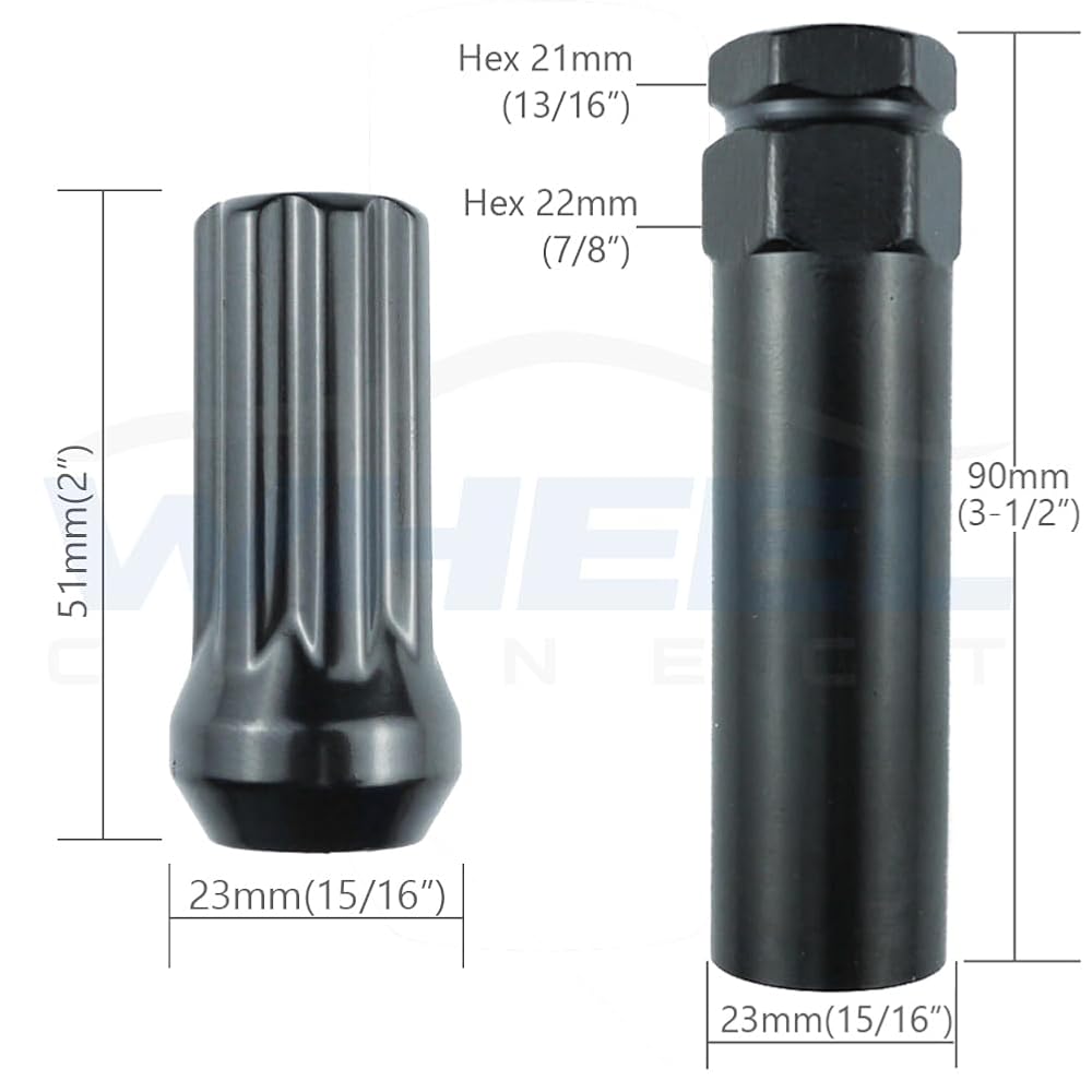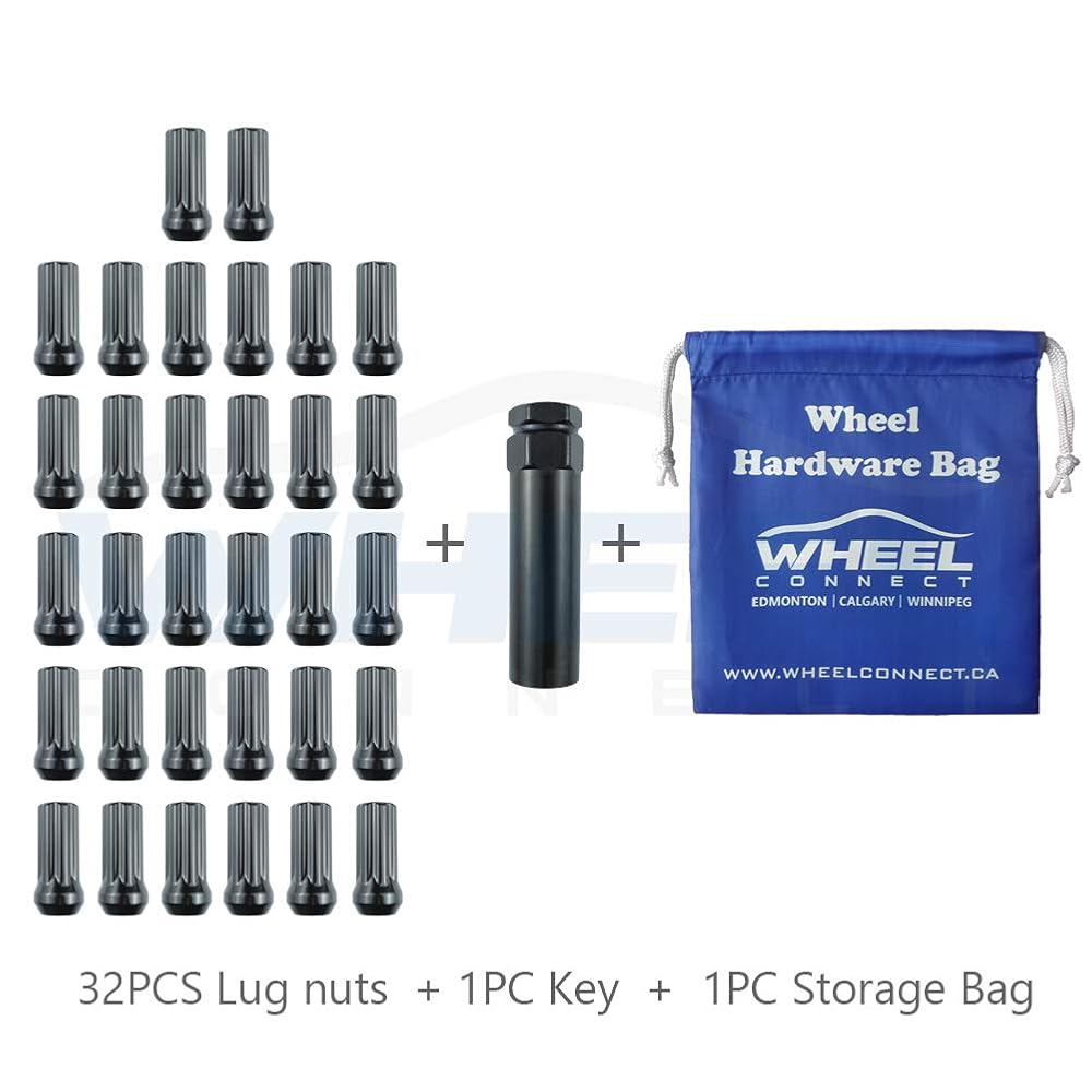 WHEEL CONNECT Spline Lug Nuts, 14x1.5, Acorn for Conical Seat. Set of 32 with 1 Key and 1 Storage Bag, for Aftermarket Custom Tuner Wheel, Steel, Black Finish.M14 X 1.5.