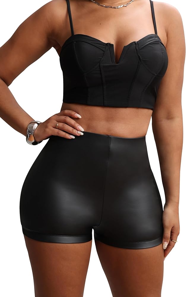 Premium Stretch Fabric: Black Faux Leather Shorts Made from a Soft Polyester-Spandex Offers Superior Elasticity and a Comfortable Second-Skin Feel While Maintaining the Look of Genuine Leather.