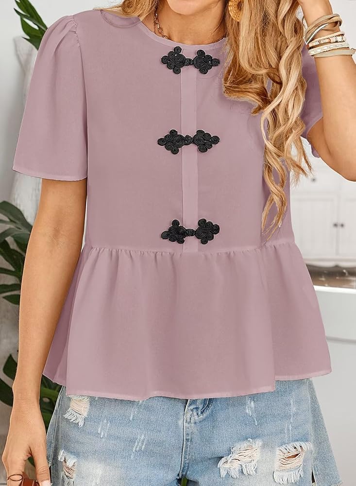 Summer Tops:Adorned with 3 decorative Chinese knot buttons, this lightweight short sleeve blouse combines oriental charm with modern style, perfect for casual summer outfits