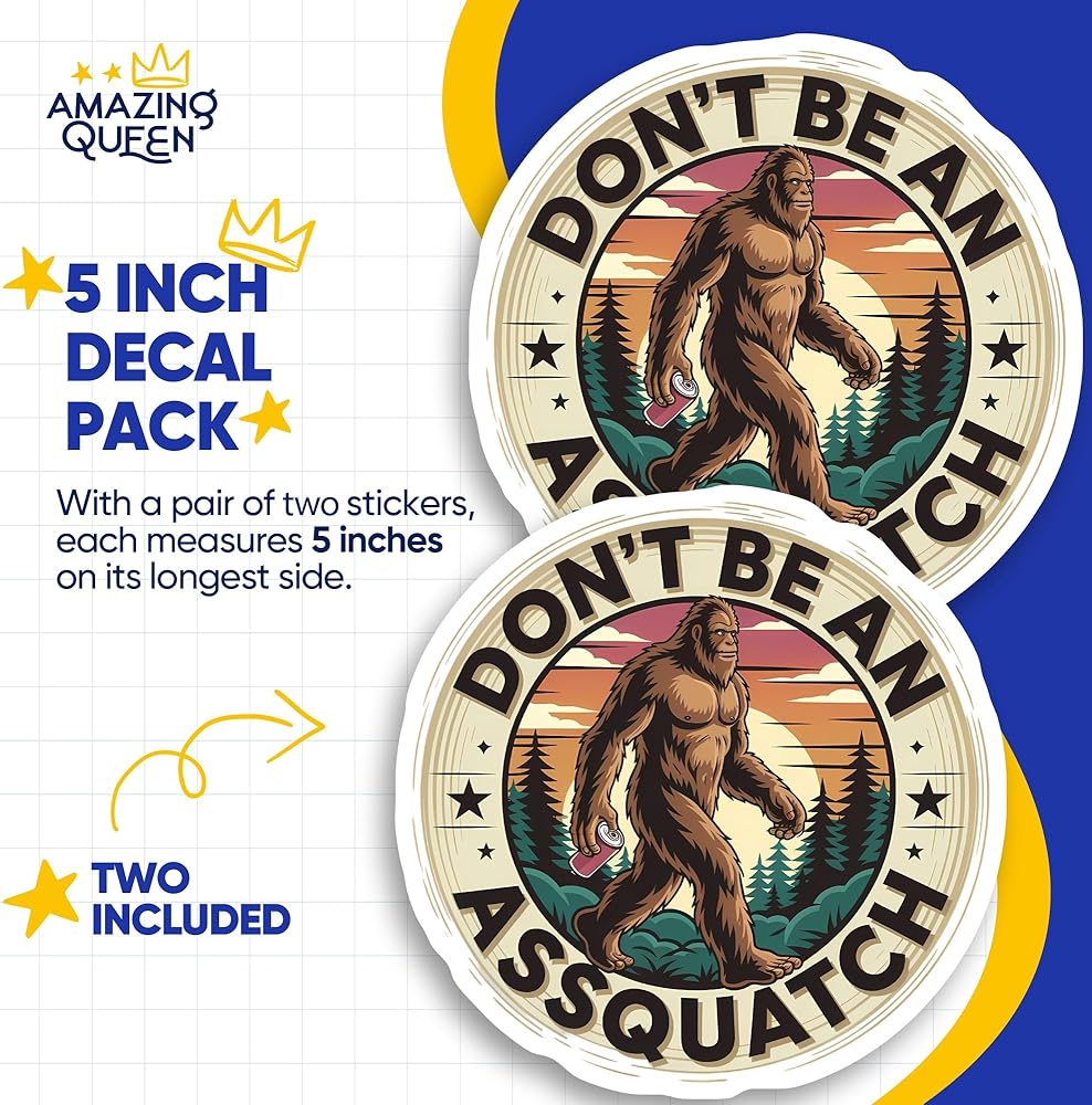 Bigfoot Stickers - Funny Sasquatch - Dont be an Assquatch - 2 Pack - 5" Wide Design - Adheres to Laptops, Tumblers, and More - Made in The USA - AQS0213