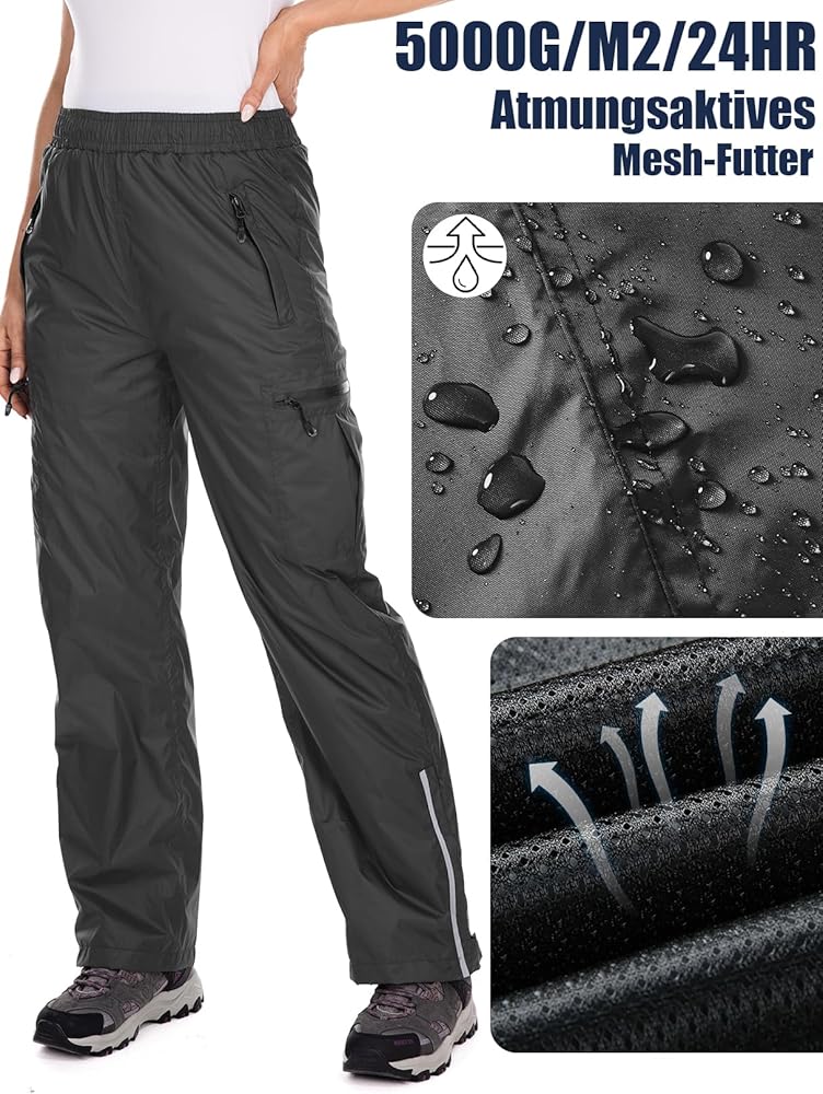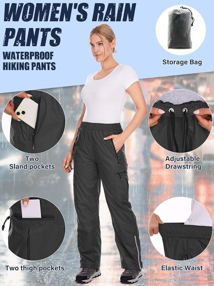 Rain pants Waterproof and Windproof: Womens waterproof pants made of advanced waterproof fabric and fully seam-sealed, it allows rainwater to coalesce and slide off the surface of the fabric, keeps you dry in wet weather. Waterproof Rating: 5000mm.
