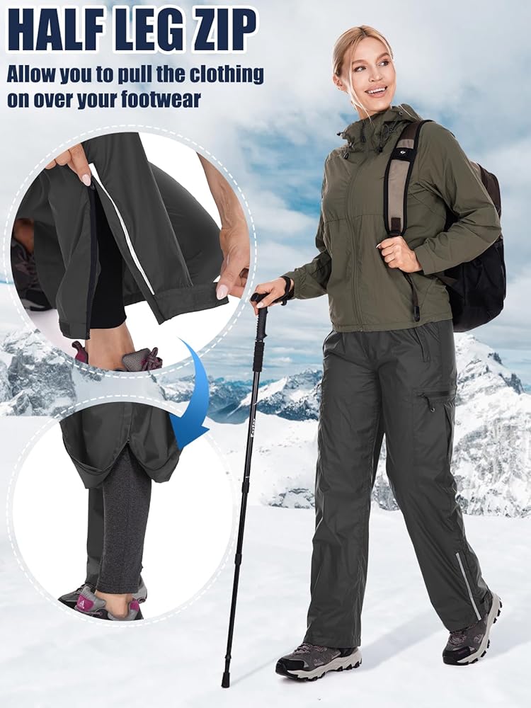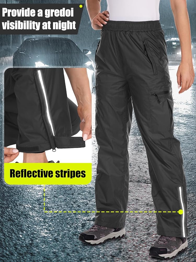 Waterproof Pants Women Safety: Womens hiking rain pants features half leg zip with velcro closure, it allow you to pull the pants on over your footwear for speed and adjust the width for different occasions. The reflective piping slit keeps you more safety during outdoor activities and dark rainy day!