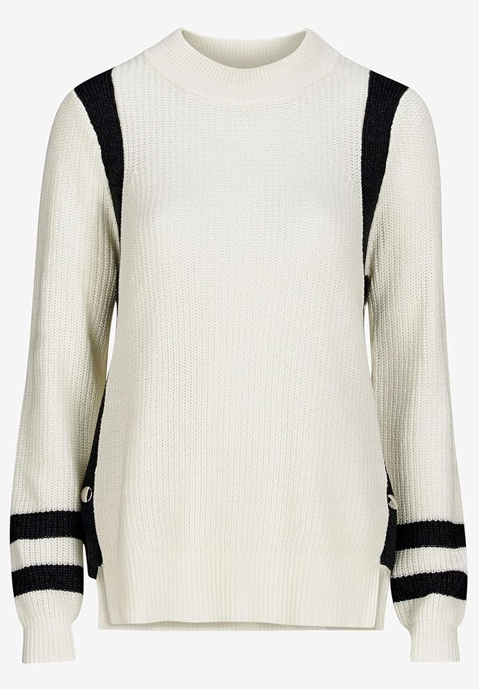 Varsity-inspired contrast stripes trim the edges of this ribbed knit pullover create a sporty-chic look. Straight silhouetteSilver button & slits on the side hemApprox. 30" hits below the hipCotton/AcrylicMachine wash cold. Imported