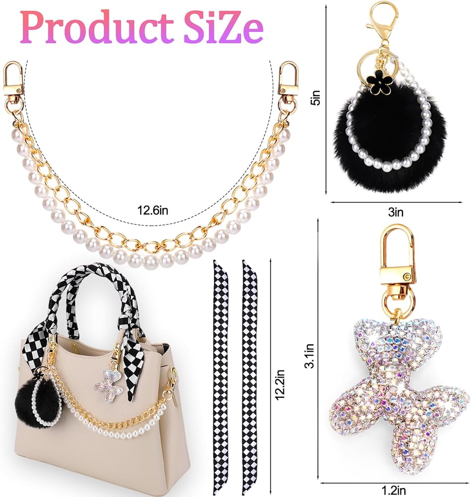 Bag Charms for Handbags: This bag charms set includes stylish pearl chain, flower and bowknot keychains that can decorate your handbags and other purse accessories, wallet or clutch. Perfect for enhancing your everyday style and making your bag and purse stand out.