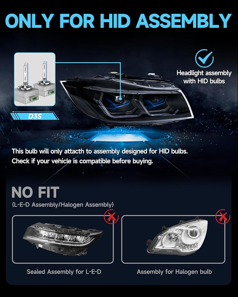 【Important Notes】D3S HID xenon headlight bulb is suitable for Buick Enclave 2013 2014 2015 2016 2017;Envision 2014 2015 2016 2017 2018;LaCrosse Regal 2014 2015 2016 2017 2018 2019;Cascada 2016 2017 2018 2019. Please note that the same model may have either a xenon or a halogen version. If your headlight bulb is a halogen bulb, it is not suitable for replacement. Before placing an order, please confirm whether the model year is applicable