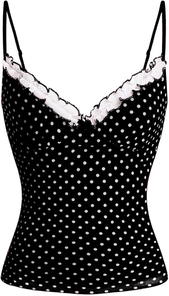 - Features: Polka dots, frill trim, spaghetti strap, v neck, sleeveless, slim fitted, womens tops, fashionable