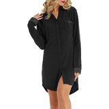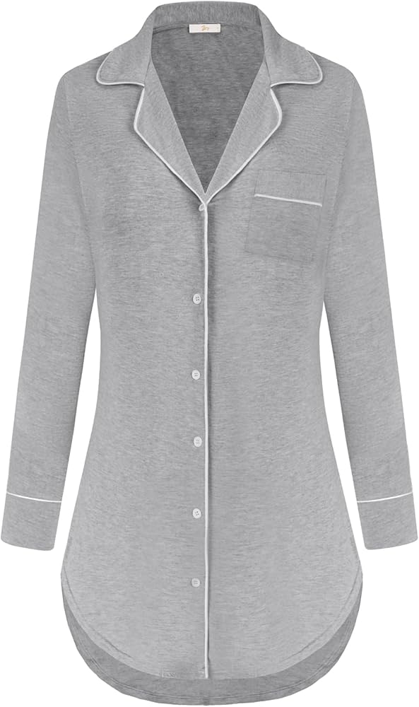 Boyfriend style button down sleep shirt for women features long sleeves with satin cuffs, lapel shirt collar, front button placket, full button top with a chest pocket on the left, a thoughtful gift for yourself, or your mother, sister, girlfriend