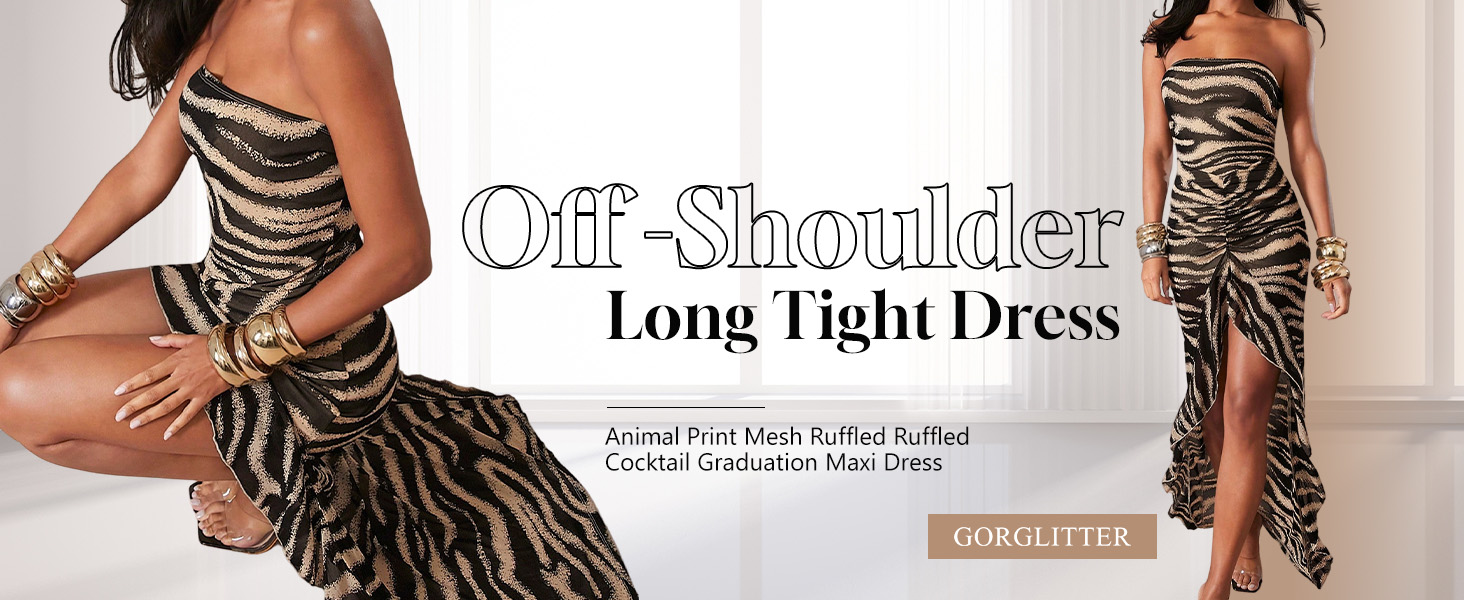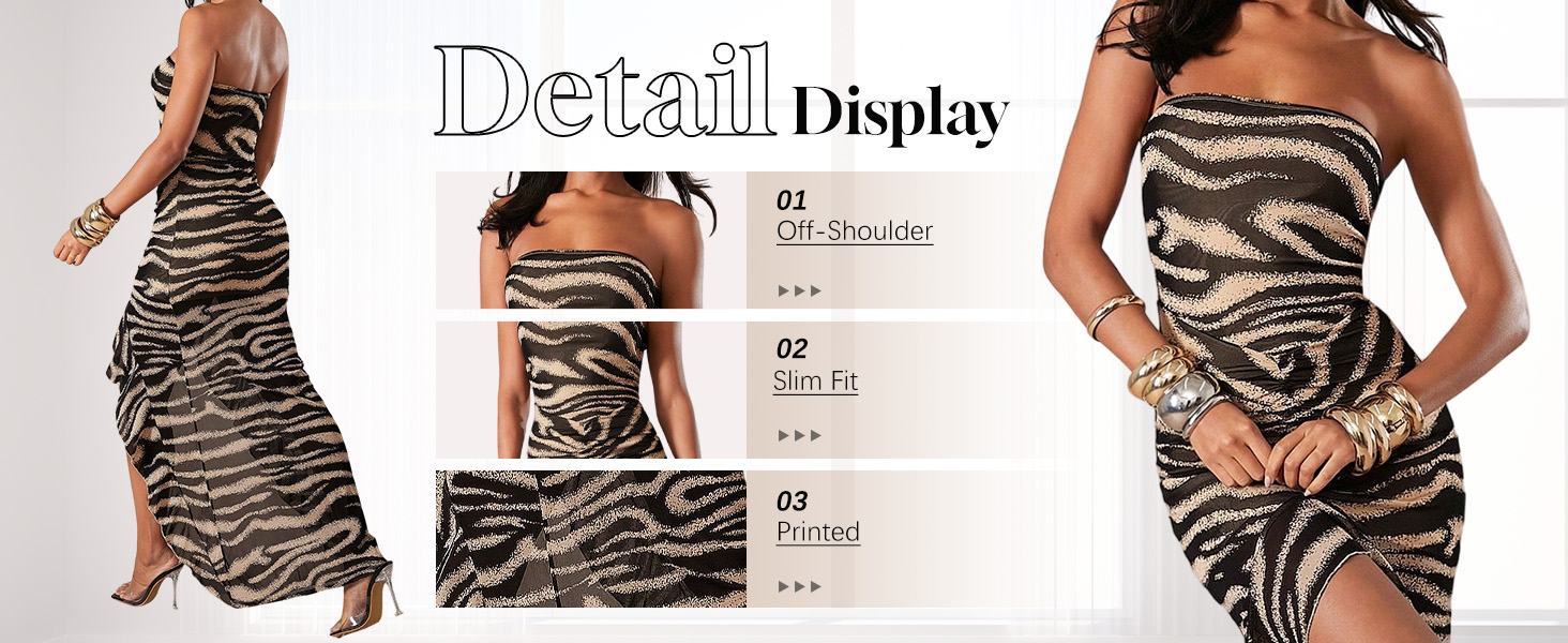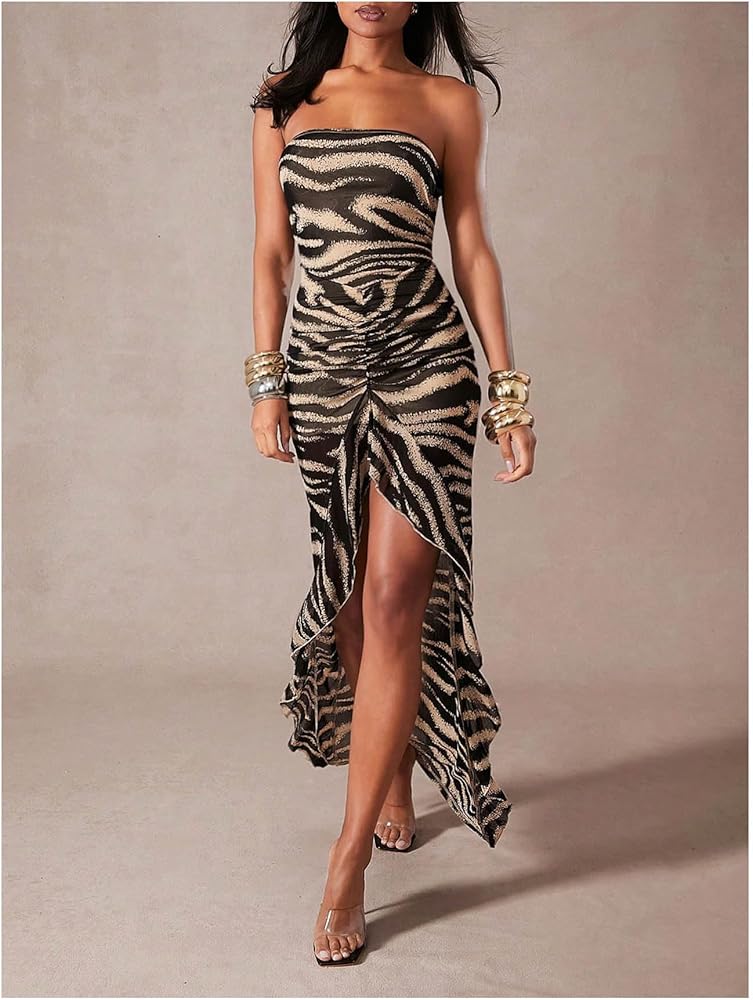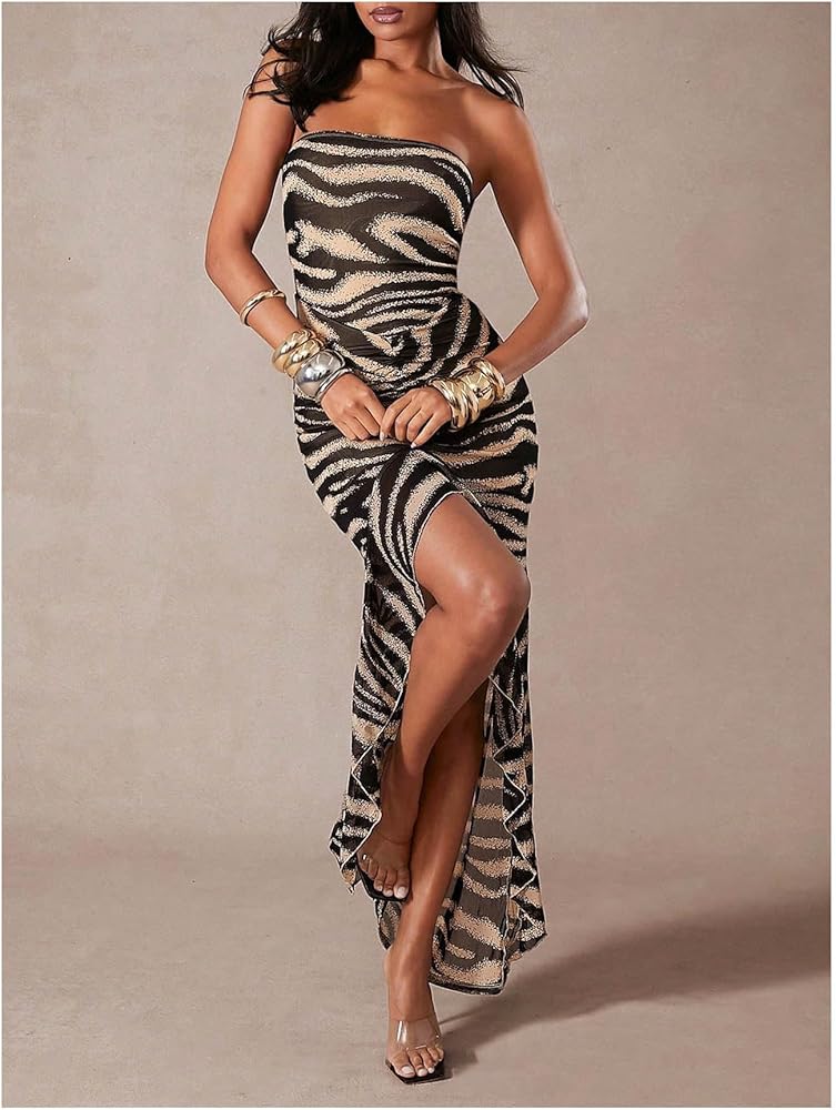 - Zebra striped print, backless, ruffle trim, split thigh, sleeveless, and maxi length, trendy strapless dress for women