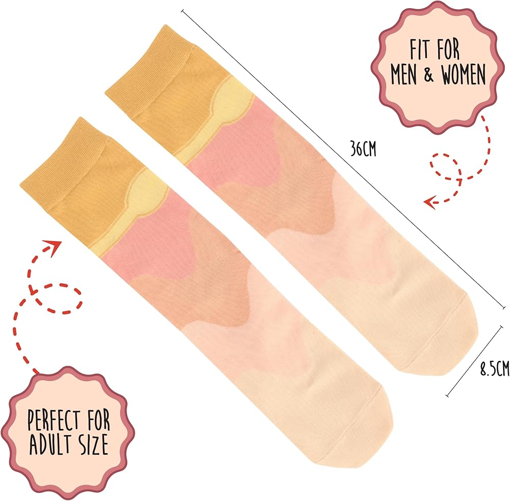 Step into whimsy with these delightful novelty wine bottle socks! Featuring a charming rosé wine bottle design in elegant peach and golden hues, these crew-length socks transform your feet into what appears to be a vintage wine bottle, complete with crown detailing. Crafted from a comfortable blend, these unisex socks offer the perfect balance of stretch and durability for all-day wear. The closed toe design and tube sock styling ensure a snug, comfortable fit while maintaining their playful appearance. Perfect for casual wear or as a conversation-starting accessory, these socks make an ideal gift for wine enthusiasts or anyone who appreciates unique fashion statements. The machine-washable construction makes care a breeze, while the quality materials help maintain the sock's shape and vibrant colors through regular wear. Available in various sizes, these versatile socks can be paired with any casual outfit for a dash of fun or worn to themed occasions for an extra touch of spirit.