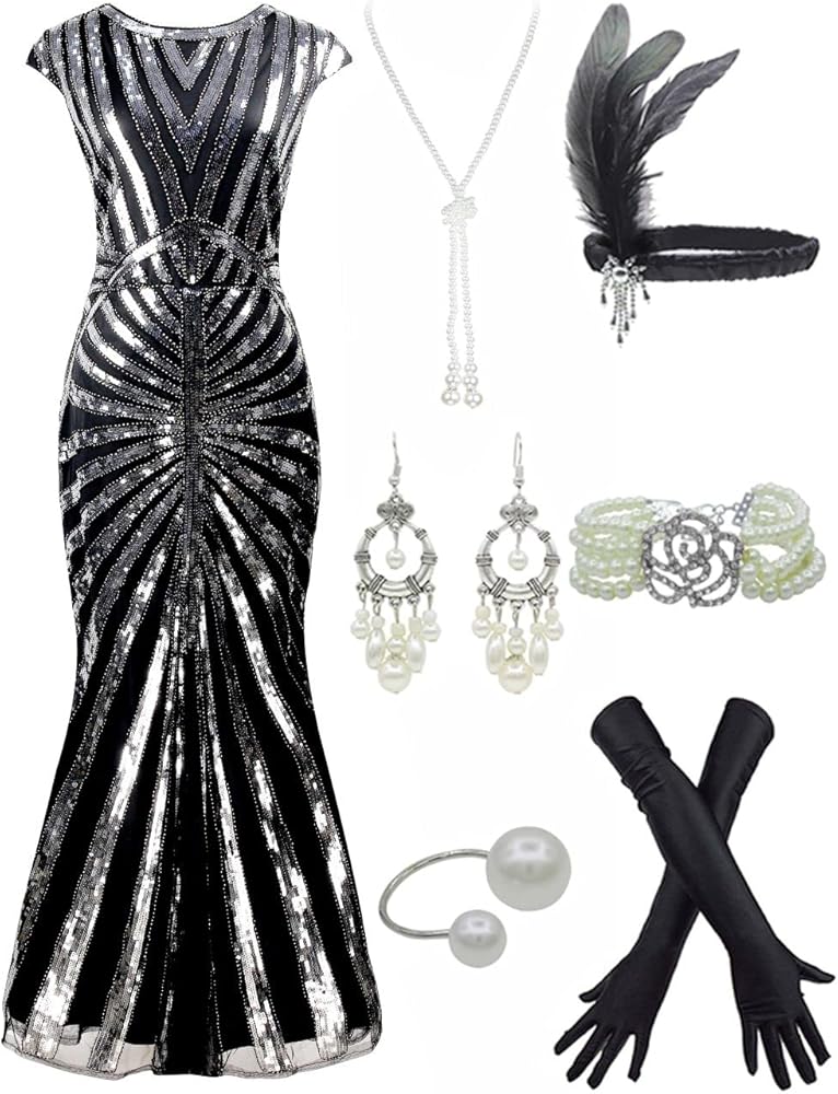 Package include: 1 x 1920s sequin tassels flapper dress , 1 xPearl necklace ; 1 x Long satin gloves; 1 x Pearl bracelet; 1 x Black cigarette holder ; 1 x Feather headband 2 x Earrings