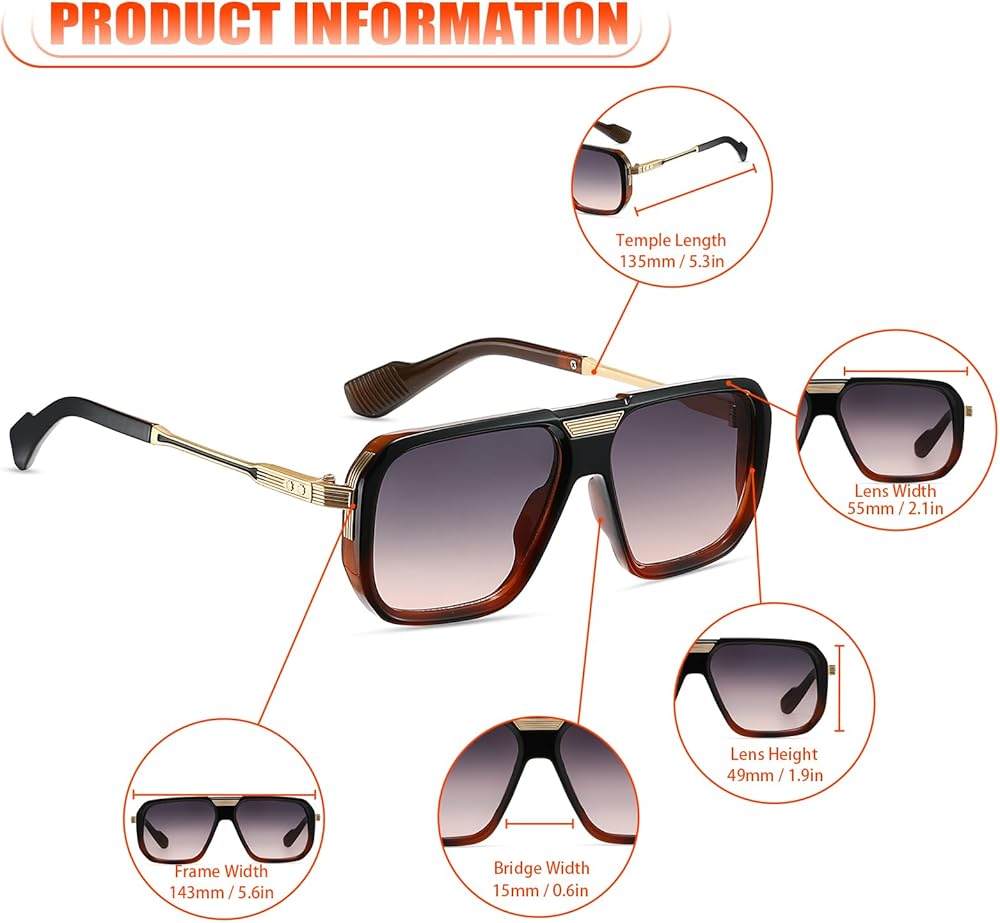 Product Dimension: Lens Width: 55 mm (2.1 inches), Lens Height: 49 mm (1.9 inches), Temple Length: 143 mm (5.6 inches), Nose Bridge: 15 mm (0.6 inches), Frame Width: 135 mm (5.3 inches). Attention: Manual measure, there may be 1 - 3mm error