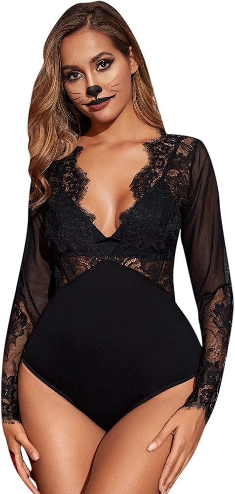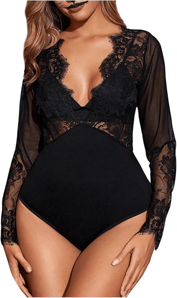 SweatyRocks Women's Sexy Lace V Neck Clubwear Top Sheer Mesh Long Sleeve Bodysuit