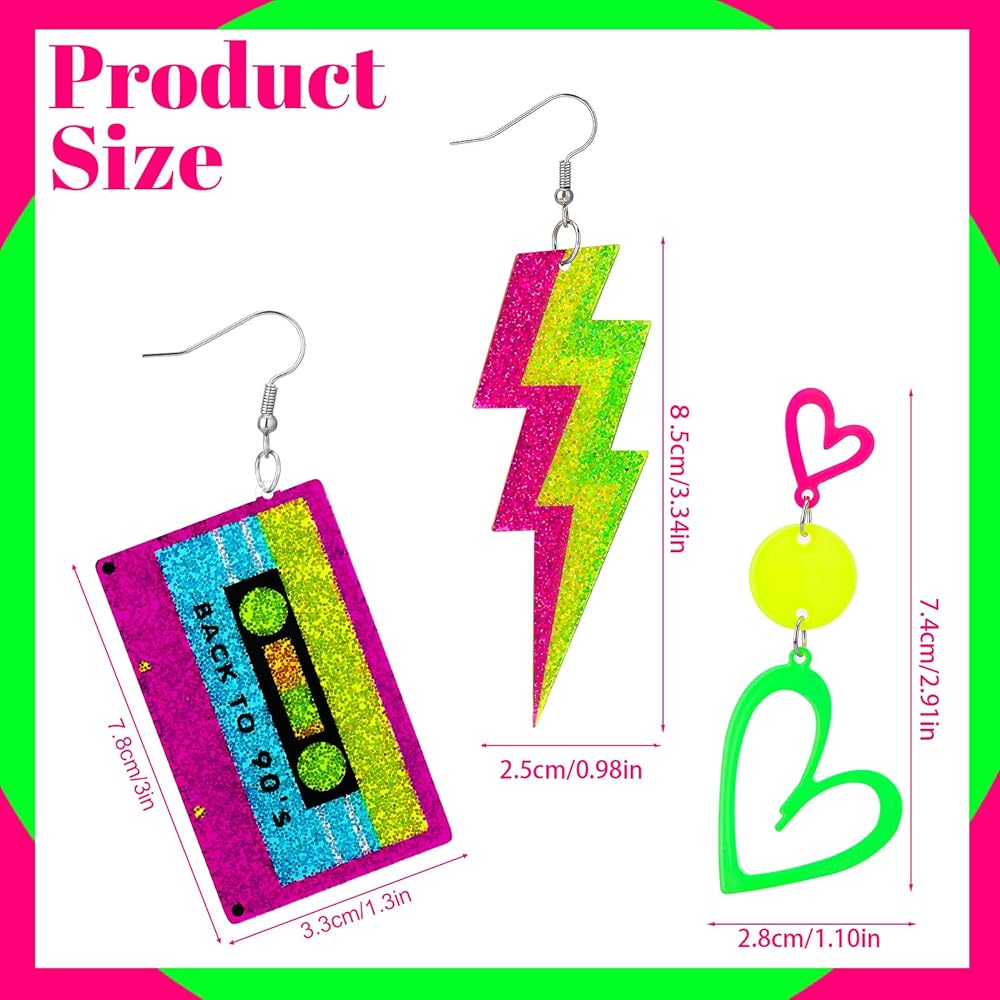 80s Neon Jewelry Accessories: You will receive 3 different earrings, 1 pair of colorful lightning drop earrings, 1 pair of heart earrings, 1 pair of vintage cassette tape earrings. Elevate your retro style with our 3 pair earring set featuring bold geometric shapes and neon hues
