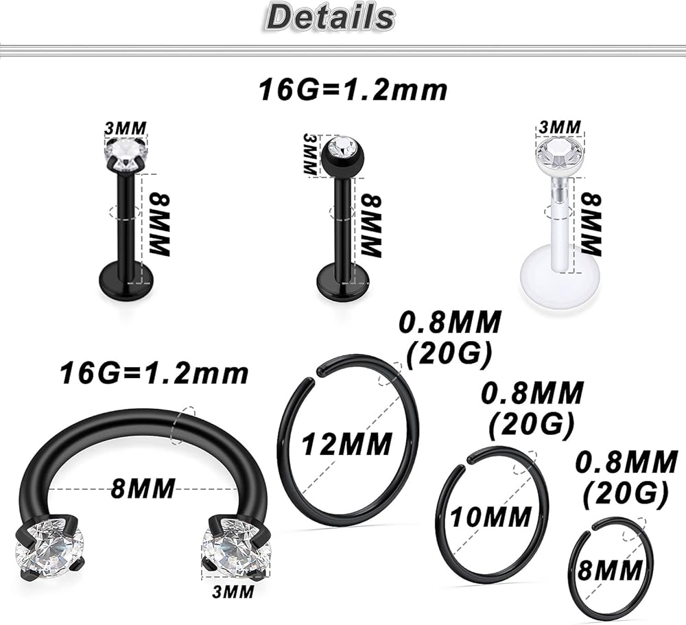Size:Lip Rings Gauge: 16G=1.2mm; Bar Lenth: 8mm(5/16inch);Balls 3mm; Small to Big Hoop Earring Gauge: 20G=0.8mm,Inner diameter: 8mm(5/16"),10mm(3/8"),12mm(1/2").