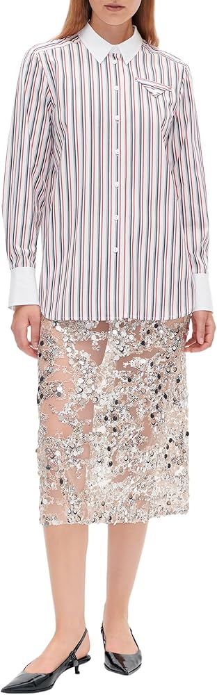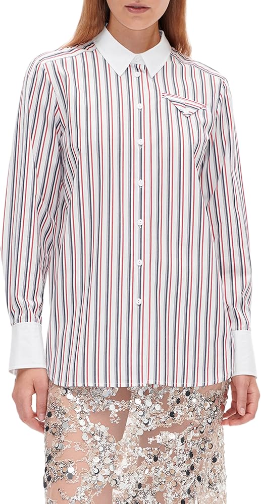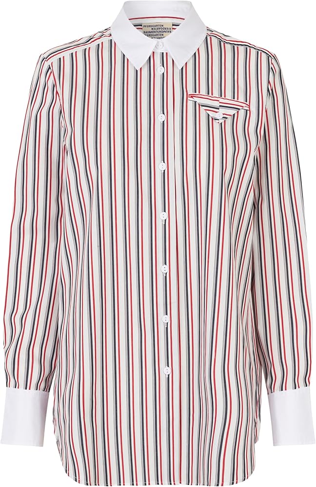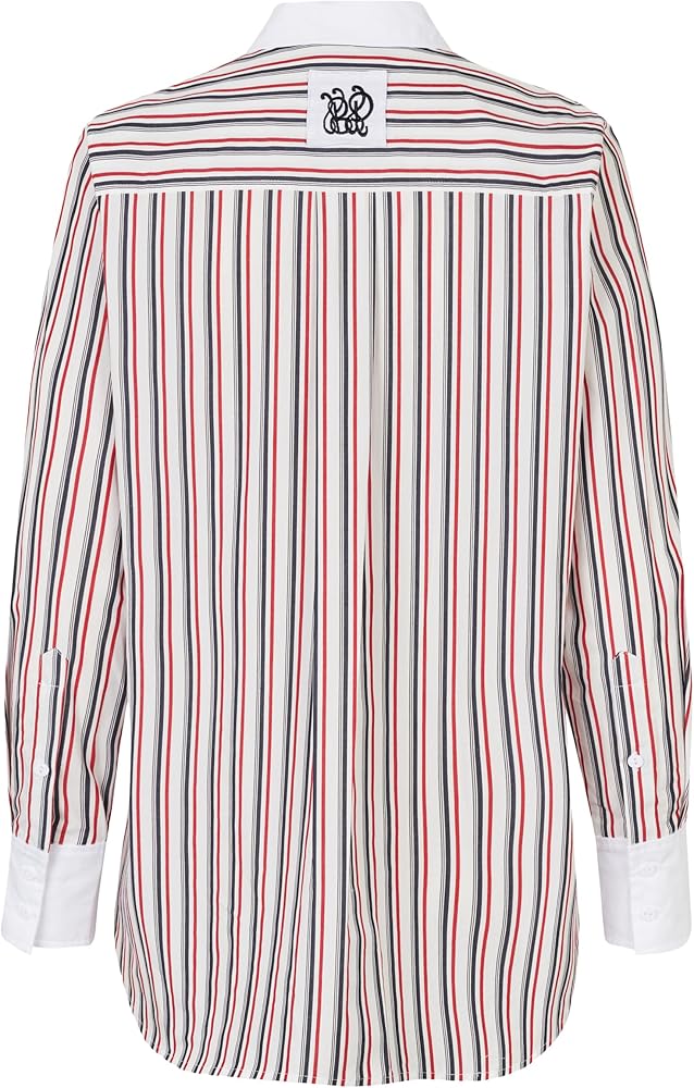- This oversized, crisp button-up shirt features a chest pocket, as well as a curved and dipped hem. There is a small logo at the back of the neck.