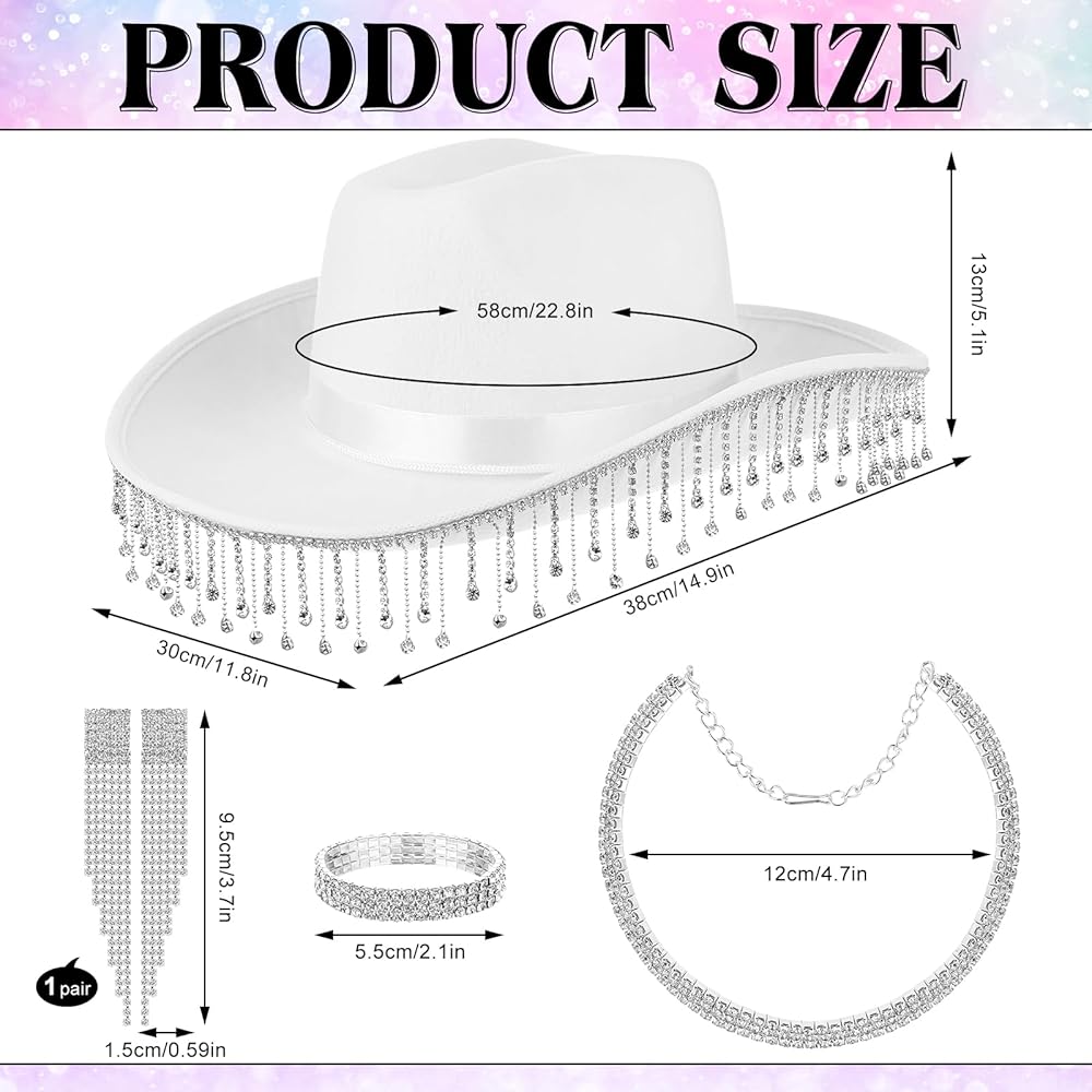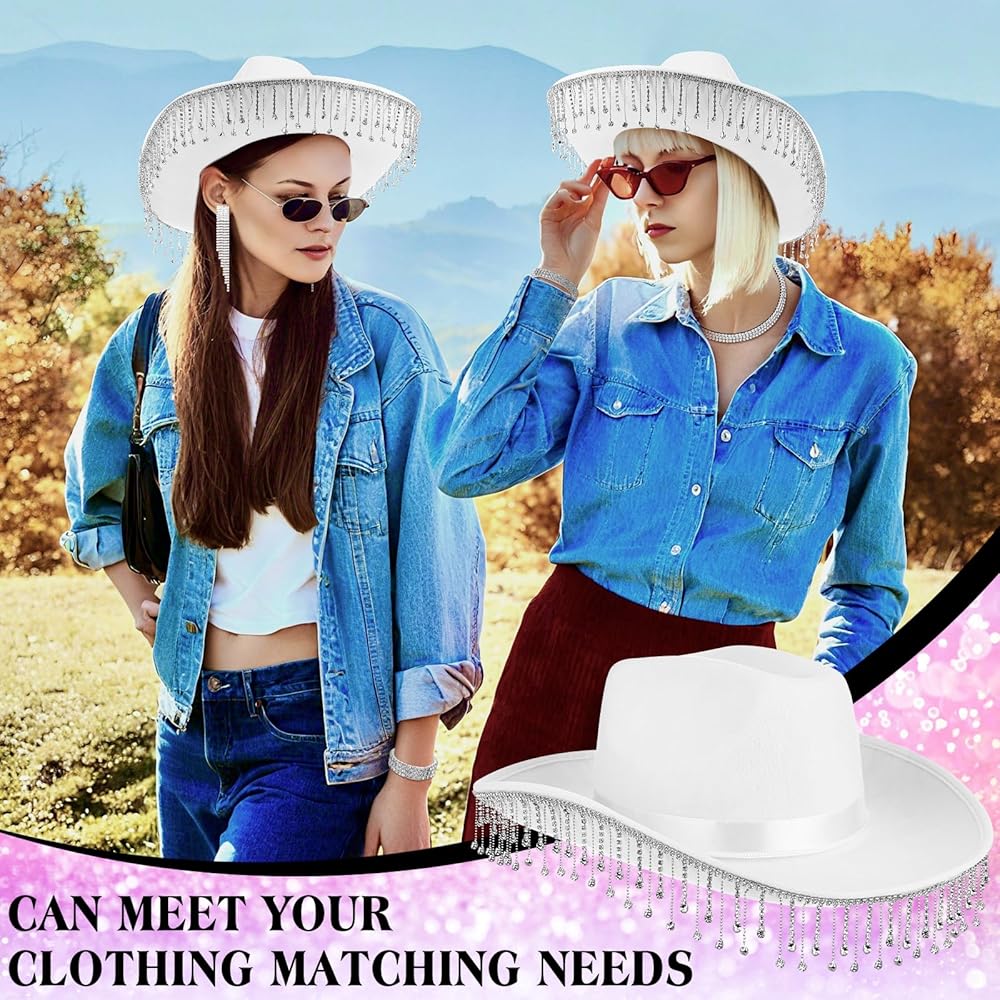 Womens Cowboy Outfit: This set includes a white cowboy hat and a pair of white heart sunglasses. The cowboy hat is decorated with shiny crystal tassels on the edge, which can easily create a dazzling party look and enhance the overall fashion sense