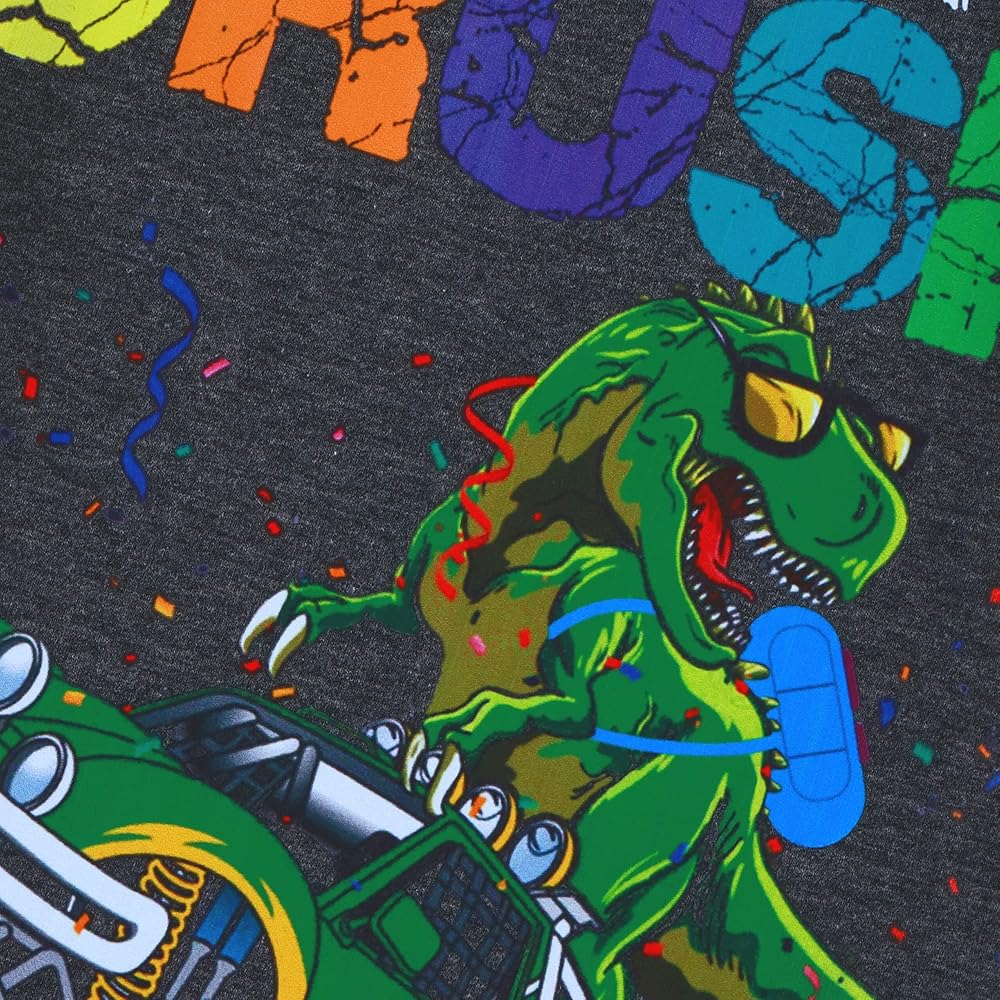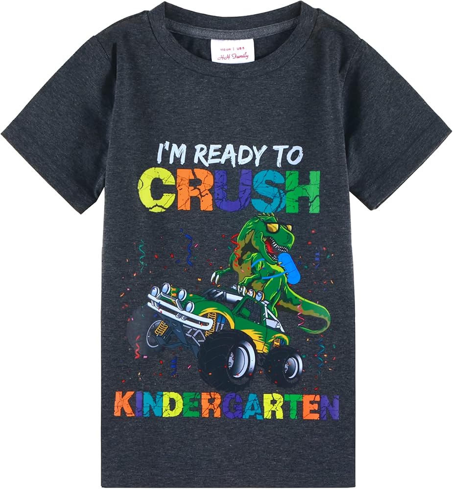 Your lovely little ones wearing our colorful first day of kindergarten shirt will be the most shinning kid in the classroom on their first day of school. Cut from a lightweight high quality comfort fabric, these kids' short-sleeve T-shirt ensures your kid stays at comfy best all day long. Decorated with a dinosaur wearing a backpack riding on a monster truck with surrounding colorful letters design, it makes just the right pick for first day of kindergarten!