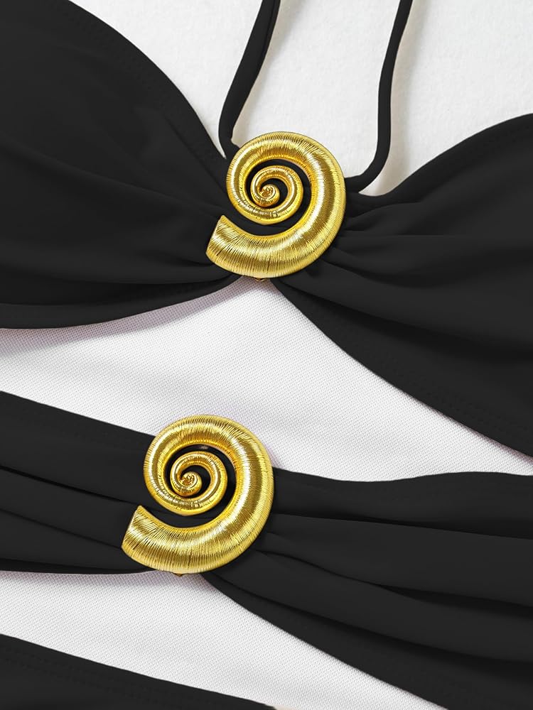 Features: Bandeau one-piece swimsuit features sexy cut-outs in the front, very textured metal conch accessories, a halter strap at the neckline for easy adjustment of tightness, sleeveless, tight fit, high leg swim cover-up skirt