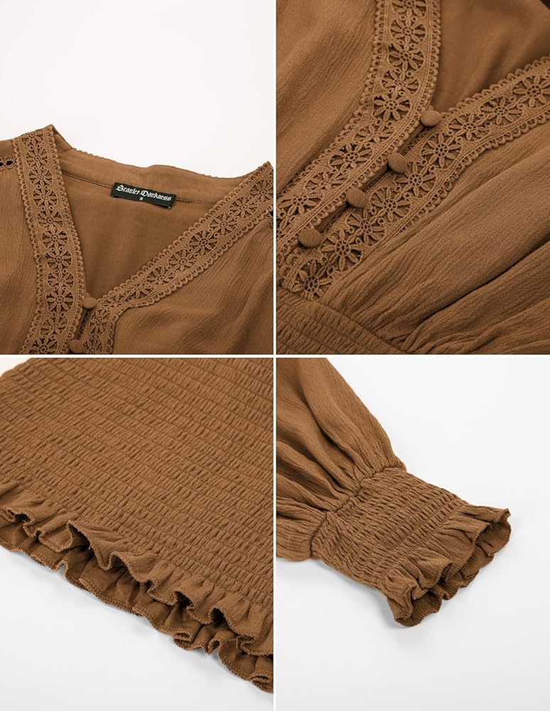 𝗖𝗵𝗶𝗰 𝗗𝗲𝘀𝗶𝗴𝗻:So sweet boho smock top featured in a soft fabrication with delicate eyelet detailing and bold balloon sleeve,timeless v neck, smocked bottom hem for added shape and flattering fit