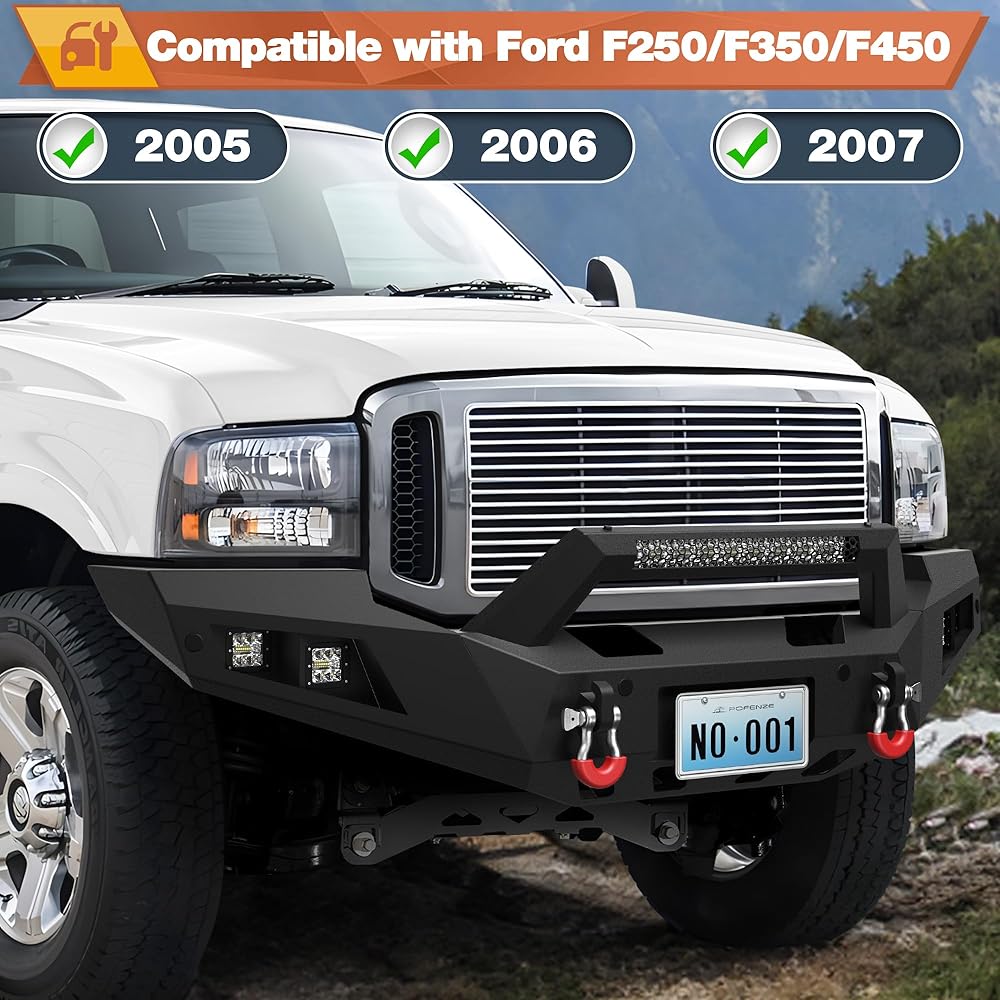 Front & Rear Bumper Fit for Ford F250/F350/F450 2005-2007, Pickup Truck Bumper Black with Winch Plate, D-rings and Lights (Compatible with 2005 2006 2007 F250 F350 F450)
