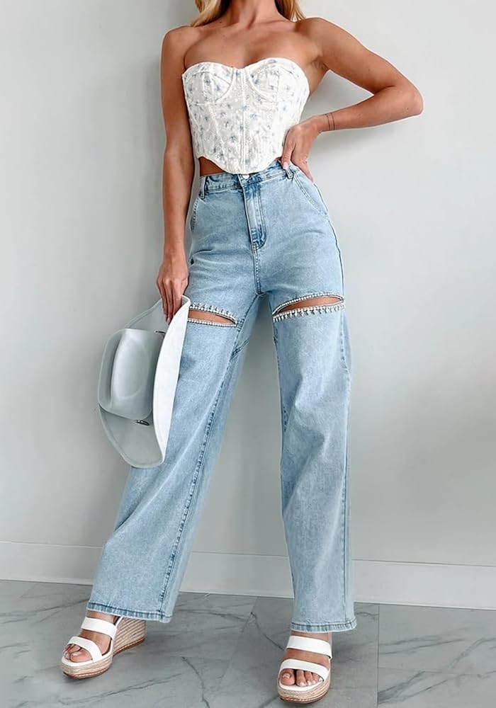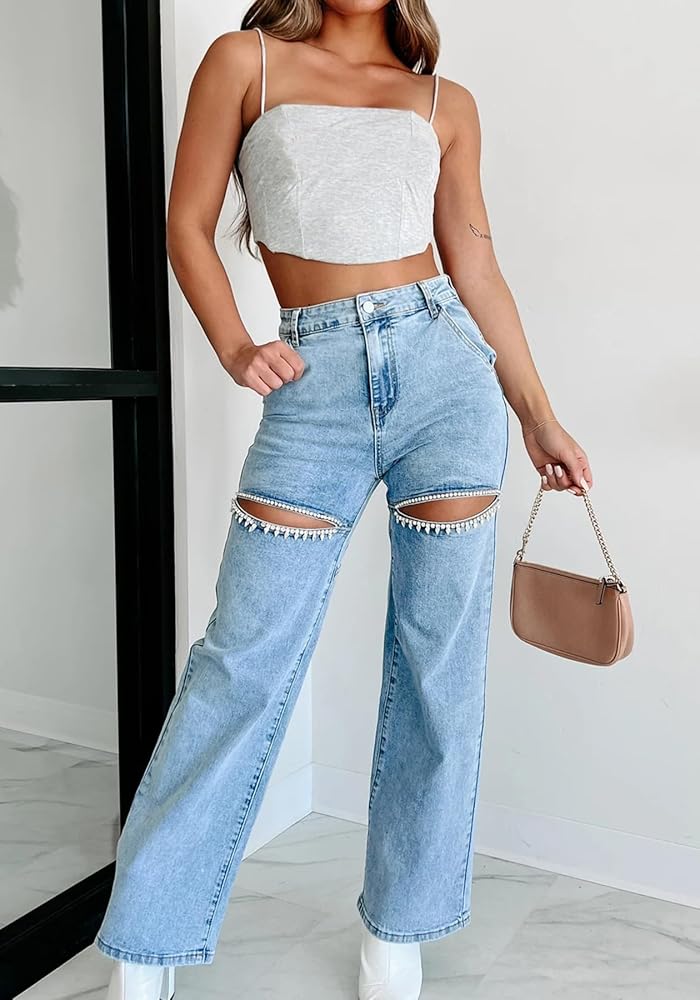 【Fashiom】:Women's rhinestone sweatpant jeans are popular style this year.The high waisted rhinestone jeans has distressed cut out details with pearl.Casual loose ripped denim pants,Plus size pants trousers,Oversized cute punk denim pants.