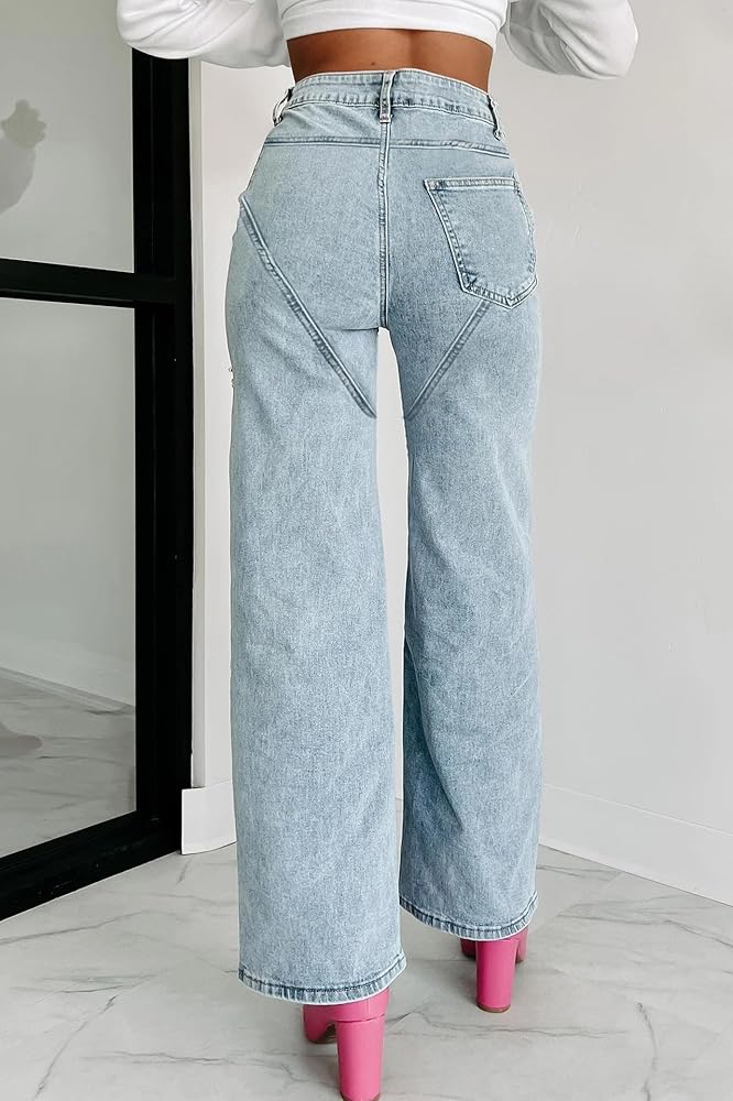 【Design】:Wide-leg beaded buckle jeans for women,Loose denim cargo pants with holes,Zip-fly and Button Closure Pearl Jeans,high waisted denim sweatpants,cut off in thigh,straight leg baggy jeans.The firm faux rhinestone won't fall off.
