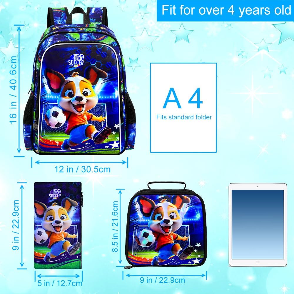 Sufficient Capacity Bookbag for Boys: This preschool backpack 16"*12"*6", dog lunch bag: 9.5"* 8"*4", and football pencil bag, all these designs make the daily use more happy more satisfied.