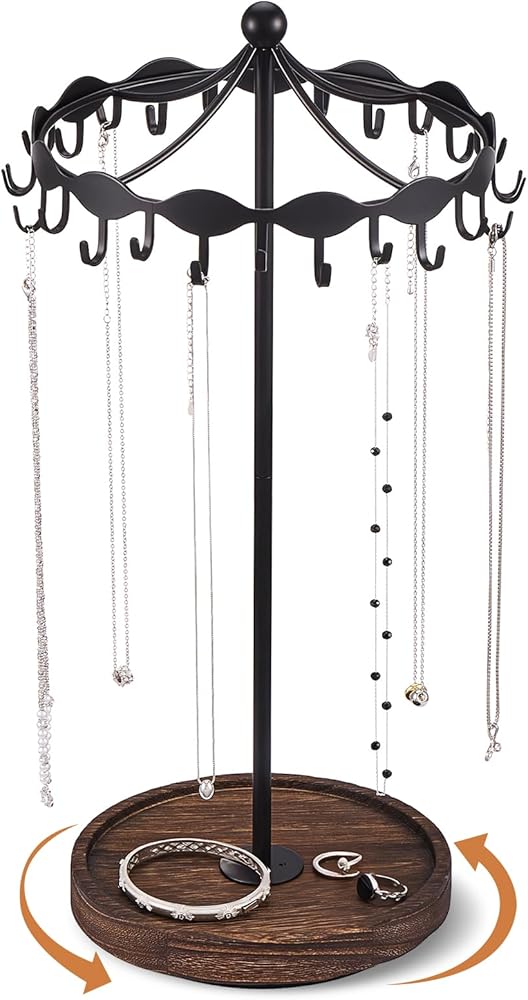 Lolalet necklace hanging stand crafted from premium metal and steady wooden base, 360° swiveling stand can beautifully display your necklaces, say goodbye to annoying tangles.