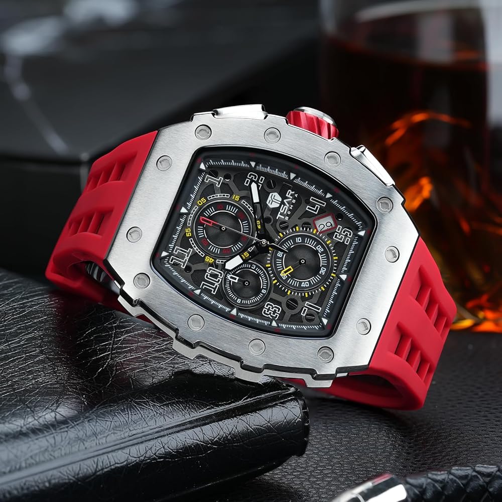 [TSAR BOMBA-Quality And Luxury Coexist] The TSAR BOMBA men's watch adopts a novel double-arch bridge tonneau-shaped case design combined with three simple and practical chronograph dials, which is fashionable and generous, and fits the wrist very well. The mirror is made of faux sapphire glass and fits perfectly with the 316L stainless steel case. At the same time, the A-level luminous function also allows you to see the time at night without hurting your eyes.